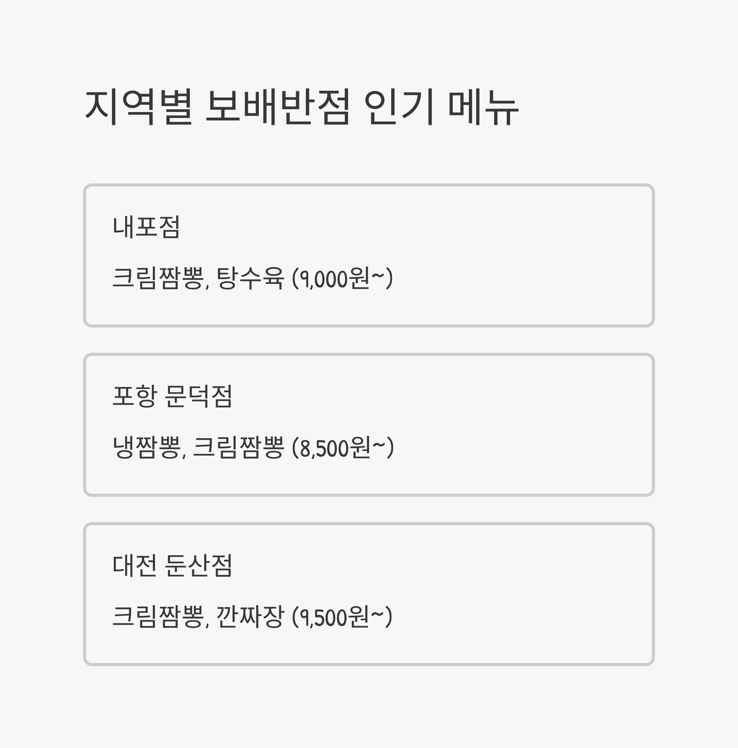 | 대전 둔산점 | 크림짬뽕, 깐짜장 | 9,500원~ |