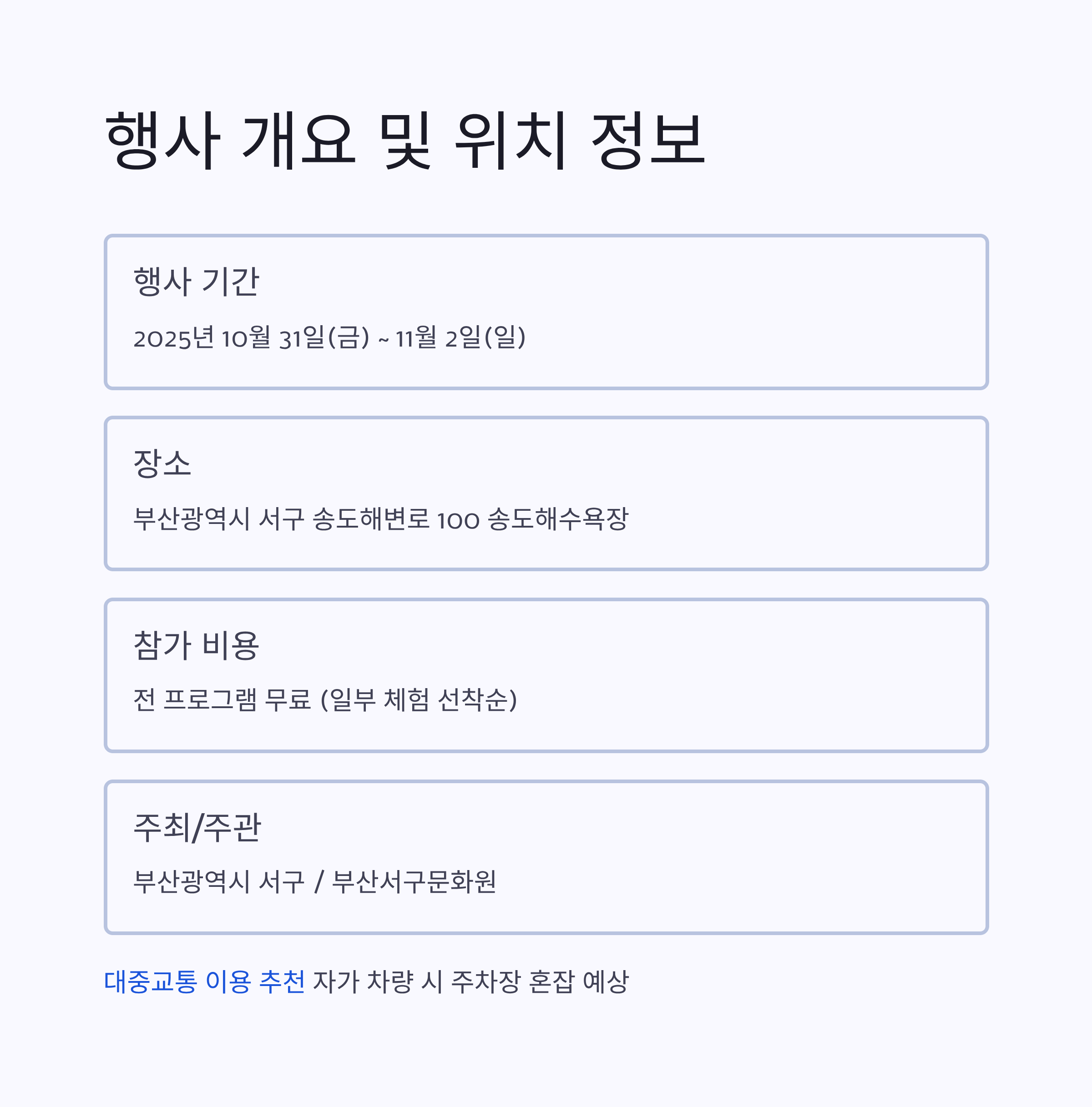 | 장소 | 부산광역시 서구 송도해변로 100 (암남동) 송도해수욕장 |