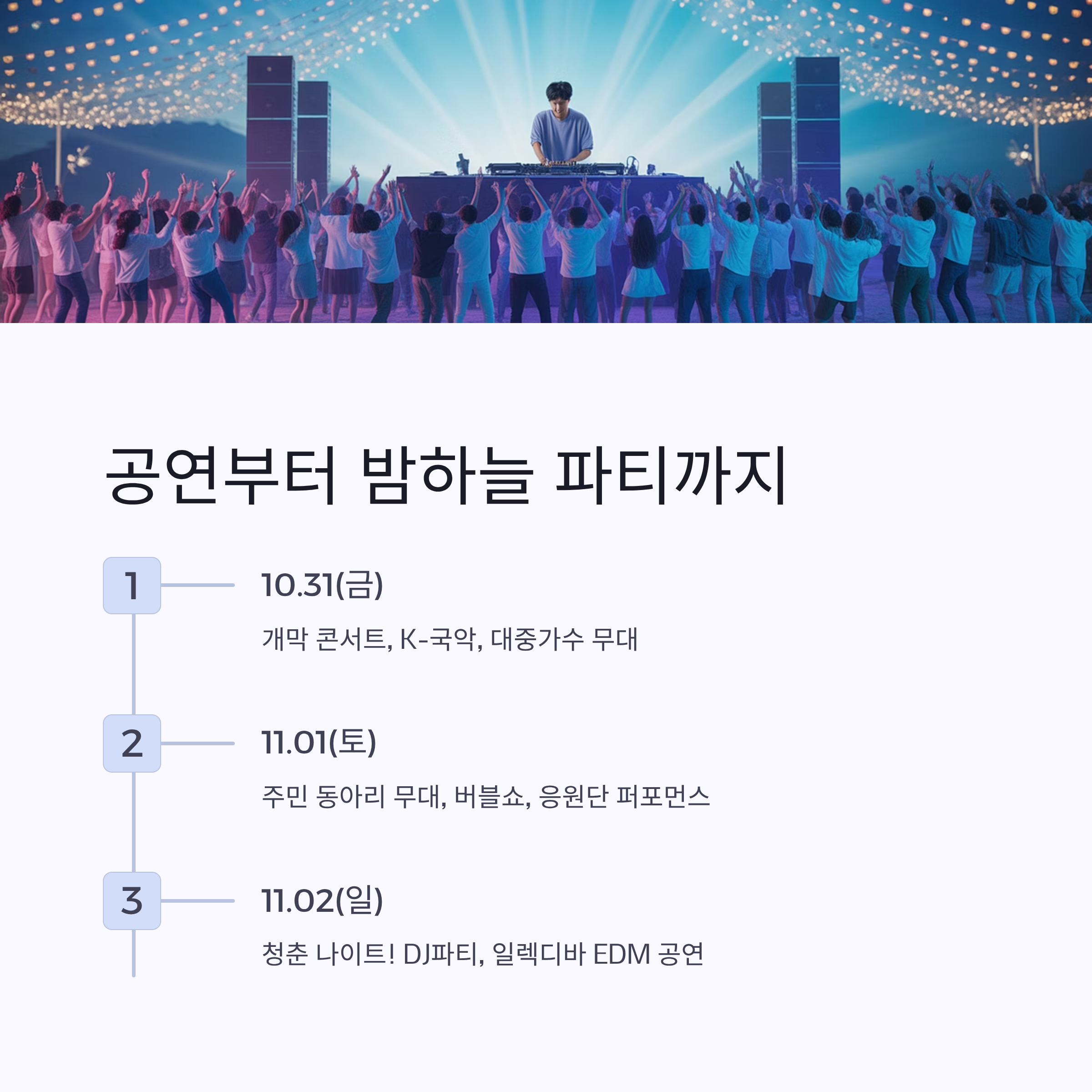 | 10.31(금) | 개막 콘서트, K-국악, 대중가수 무대 |