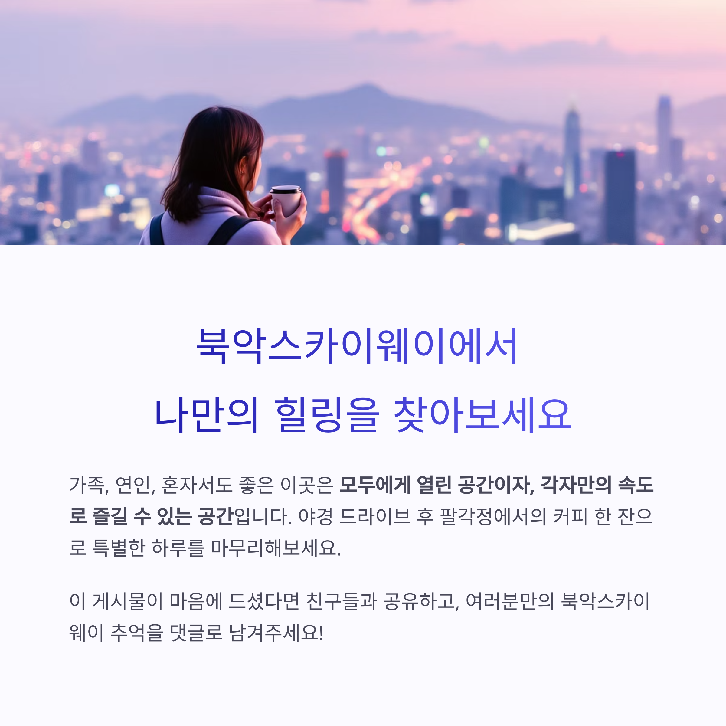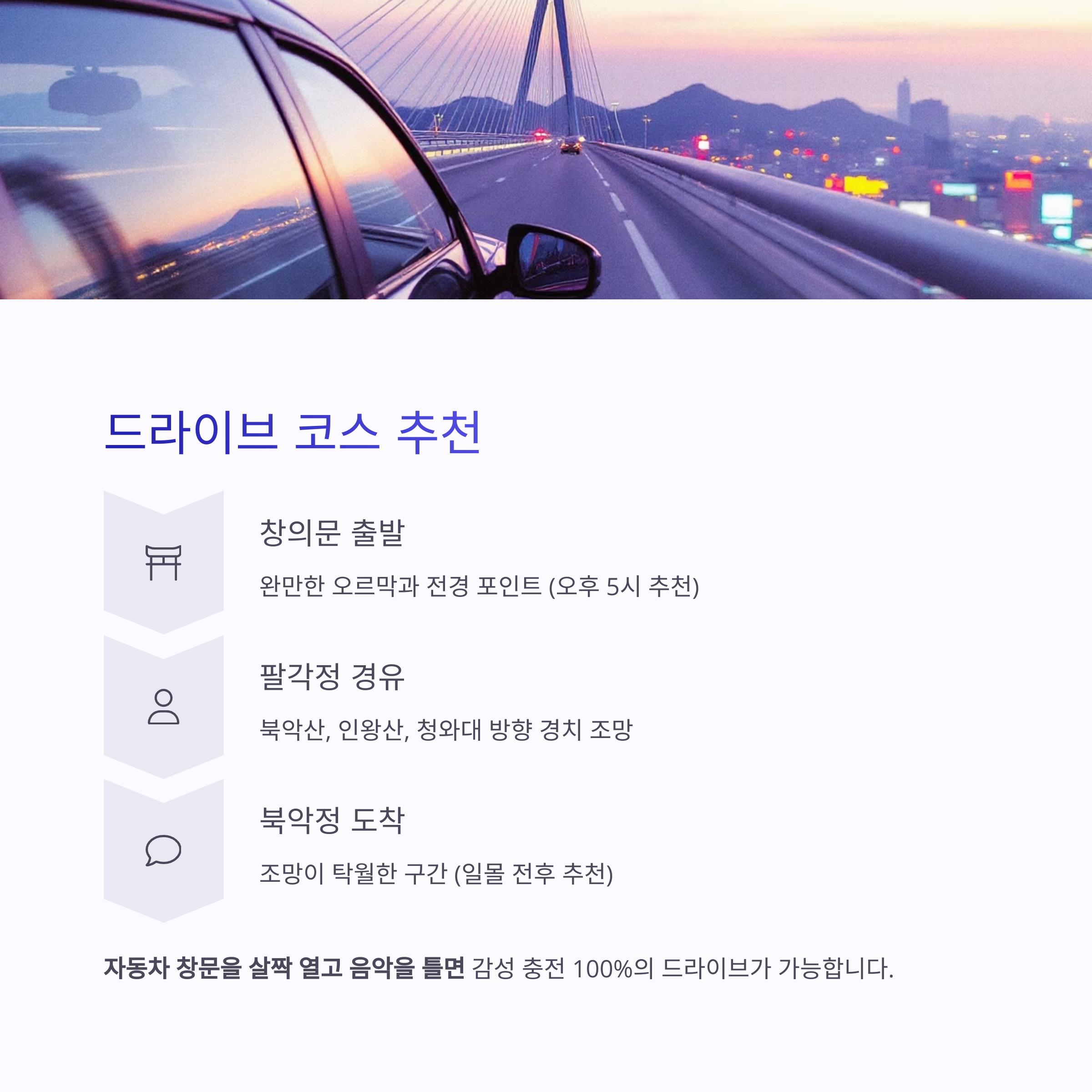 이 글에서는 북악스카이웨이의 주요 코스, 드라이브 팁, 산책 포인트 등을
