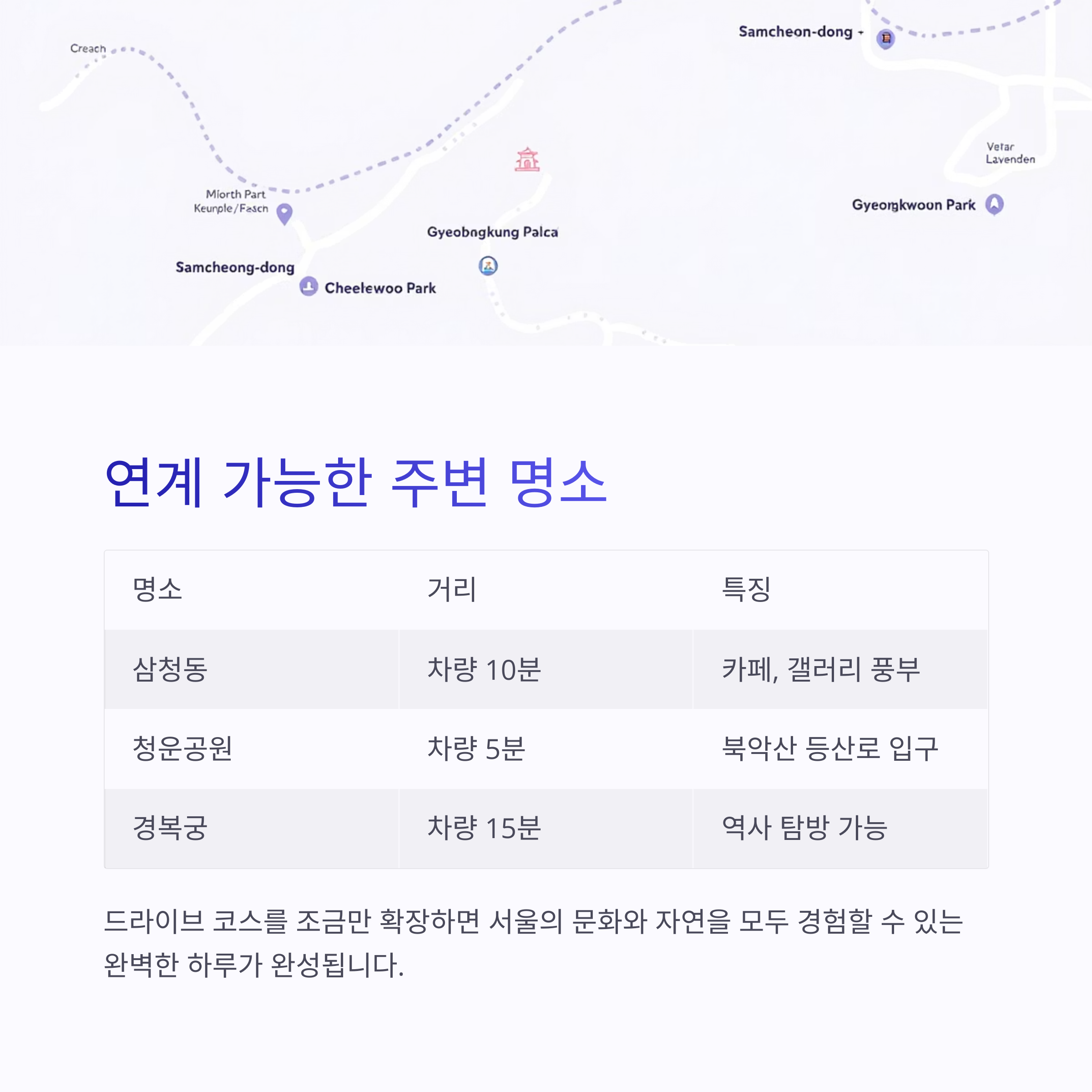 | 경복궁 | 차량 15분 | 역사 탐방 가능 |