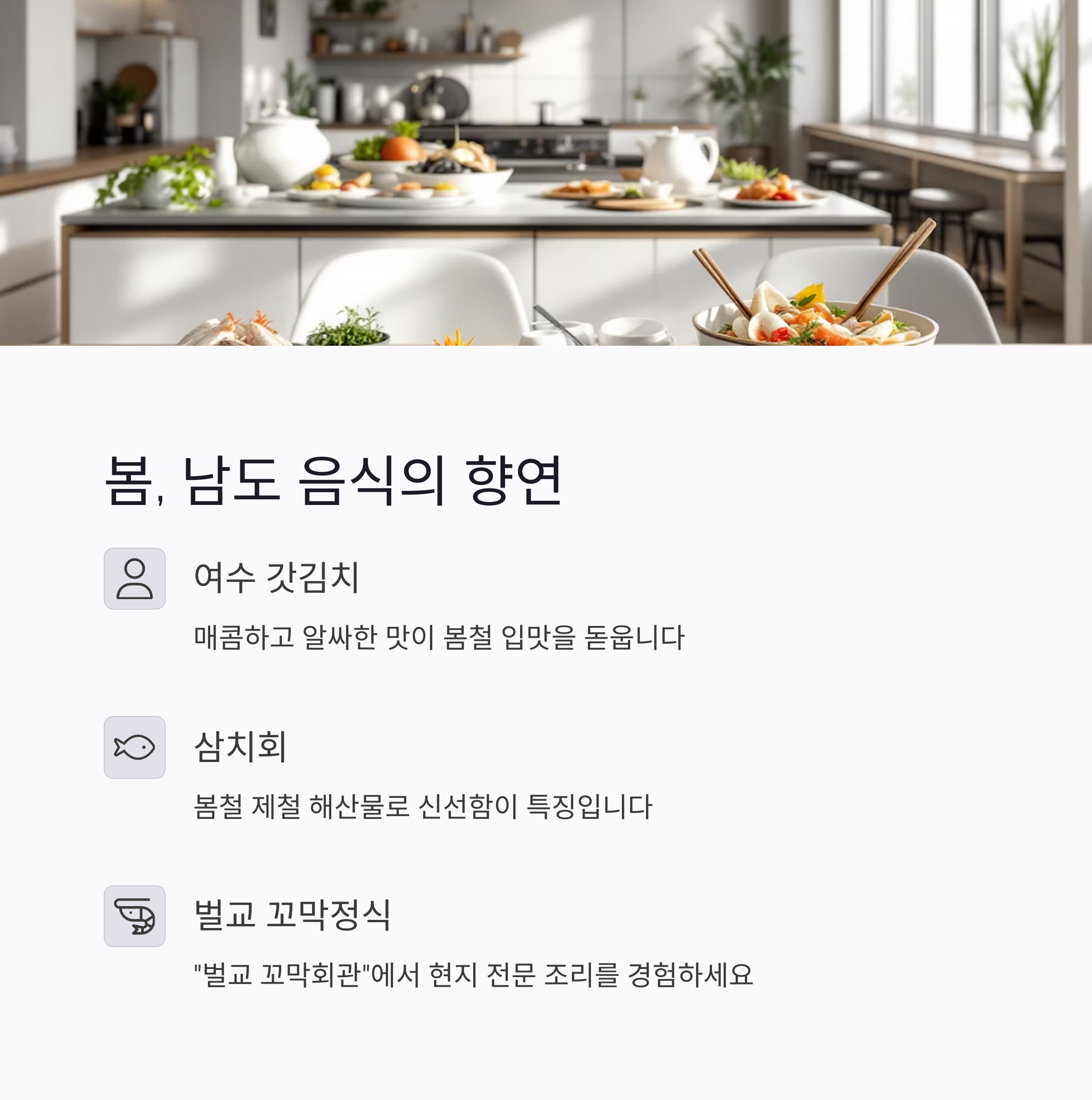 "여수 중앙시장 내 수산물 직판장"과 "벌교 꼬막회관"은 봄에 붐비는 대표 핫플입니다.