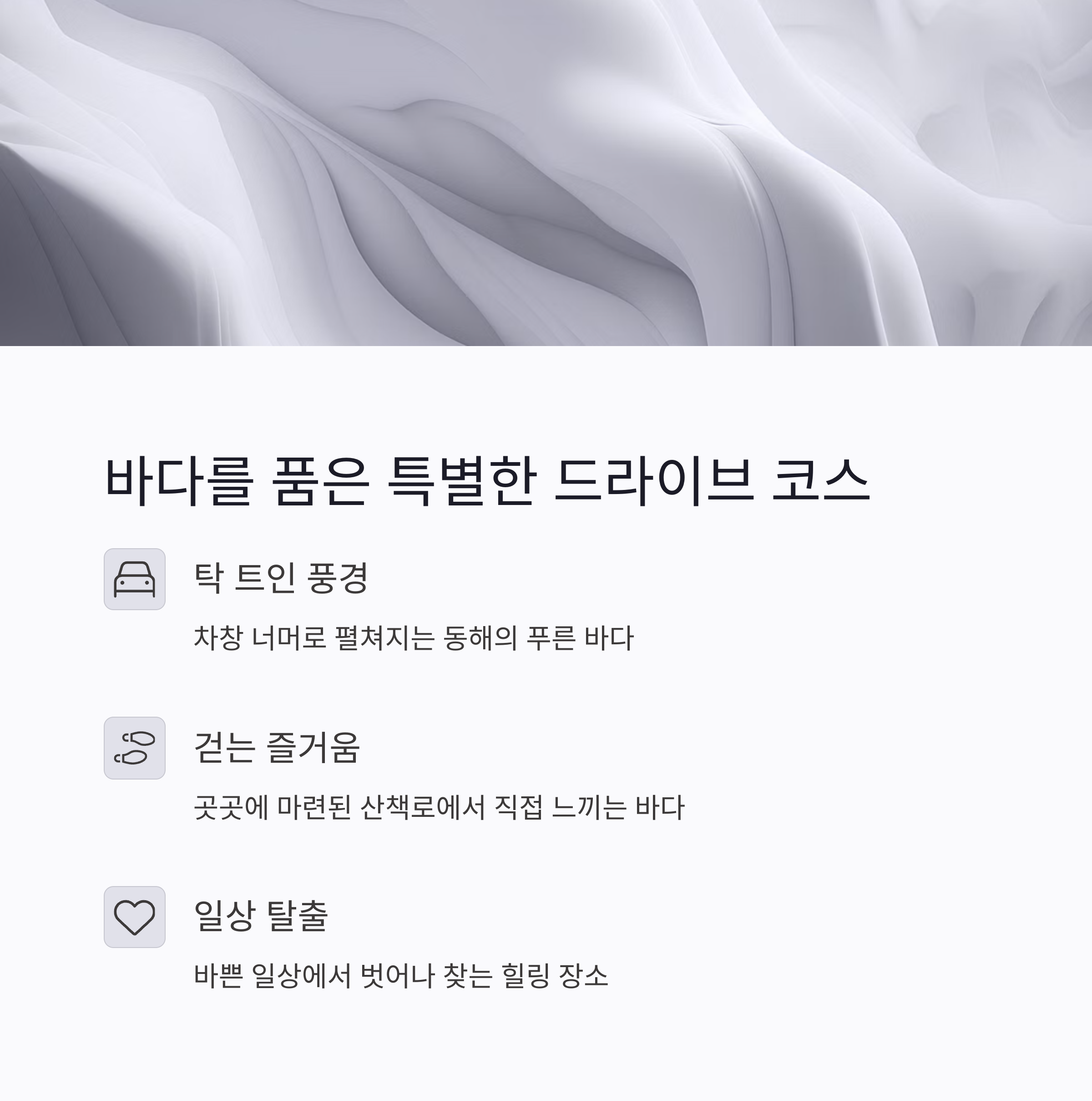 삼척 해안도로는 일상의 피로를 씻어내는 작은 드라마의 배경이 됩니다.