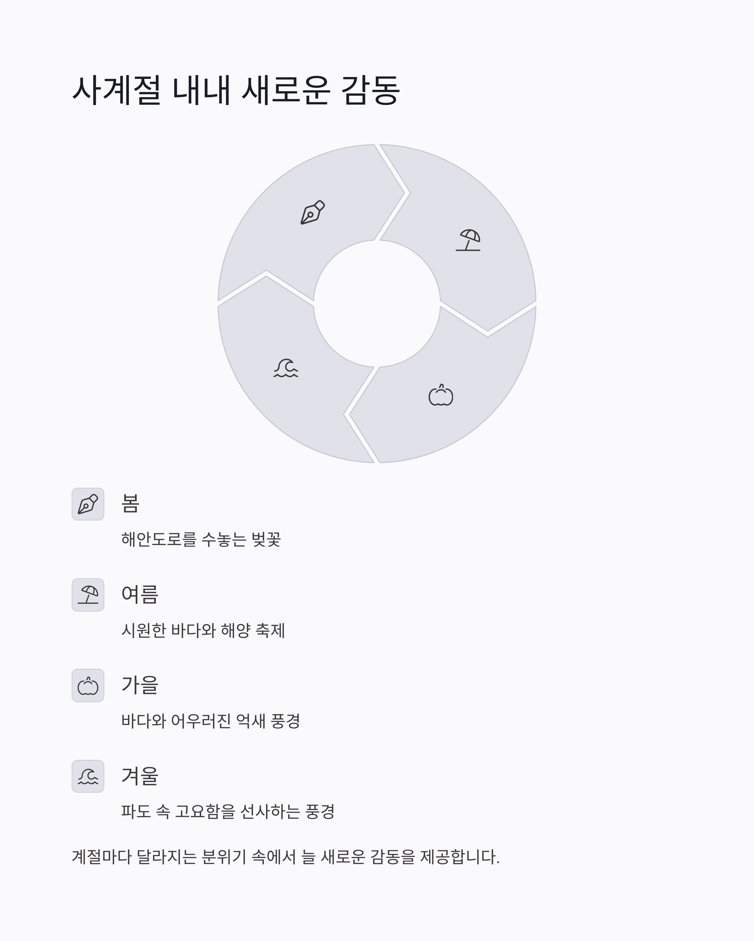 해안도로 주변에는 카페, 쉼터, 자전거 도로 등 소소한 즐길 거리도 많습니다.