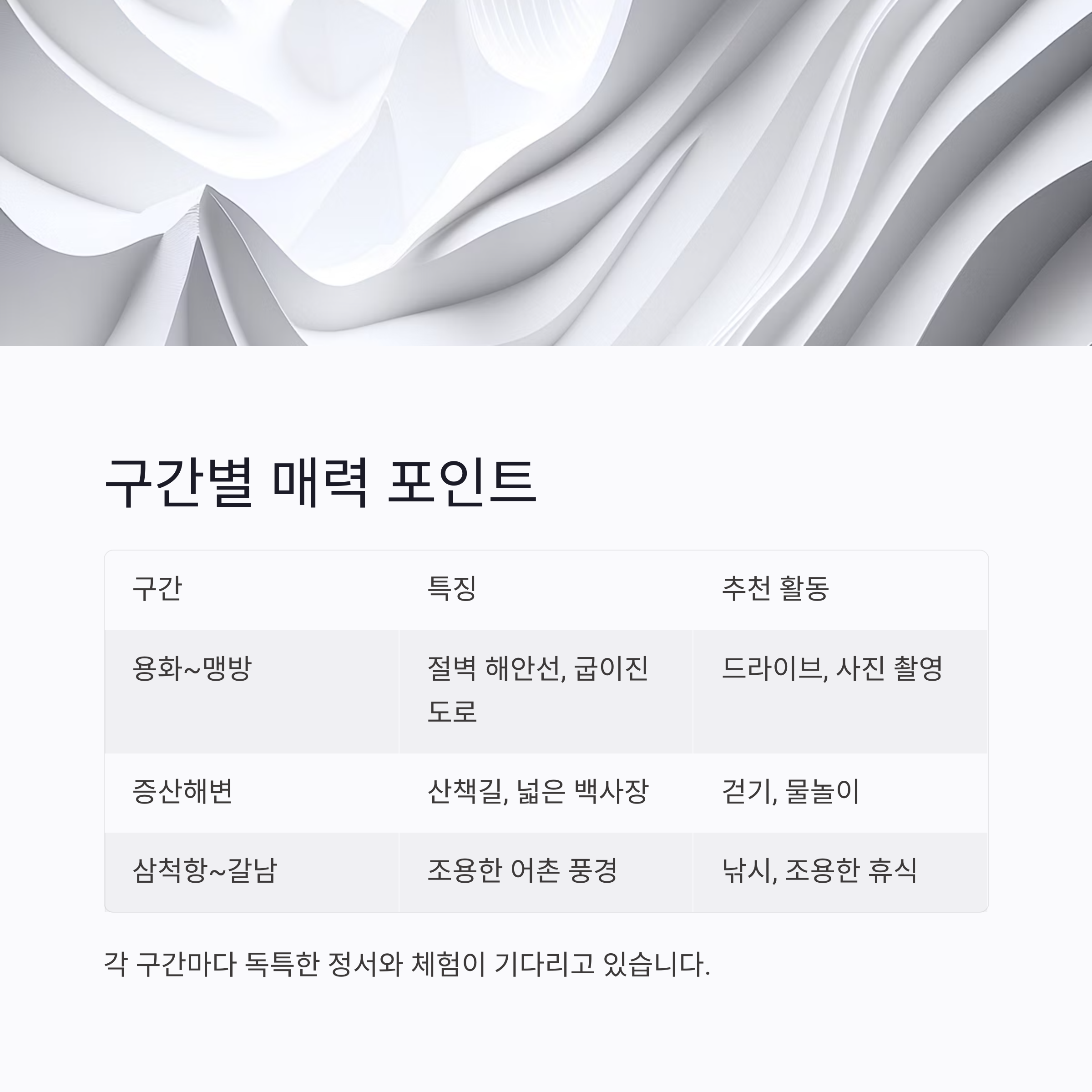 | 용화~맹방 | 절벽 해안선, 굽이진 도로 | 드라이브, 사진 촬영 |