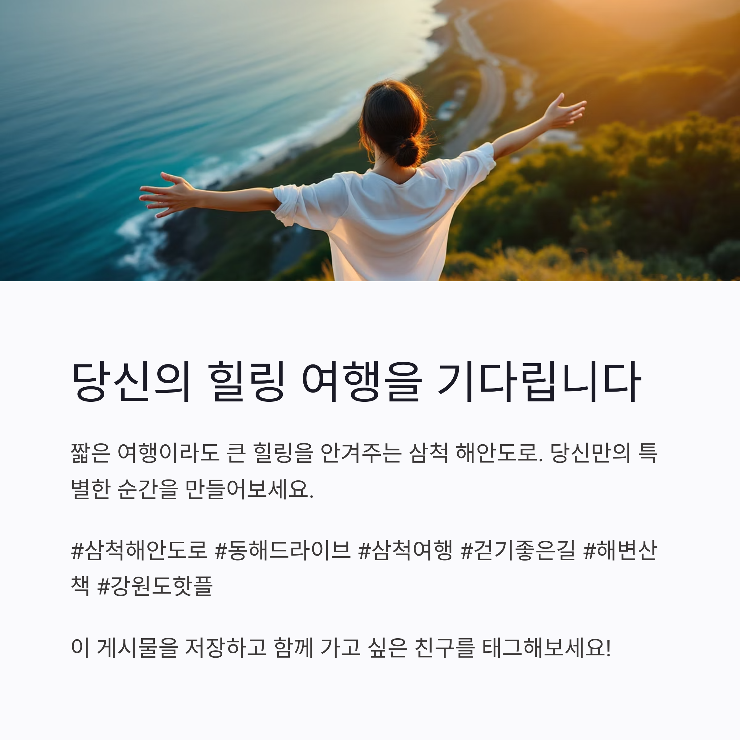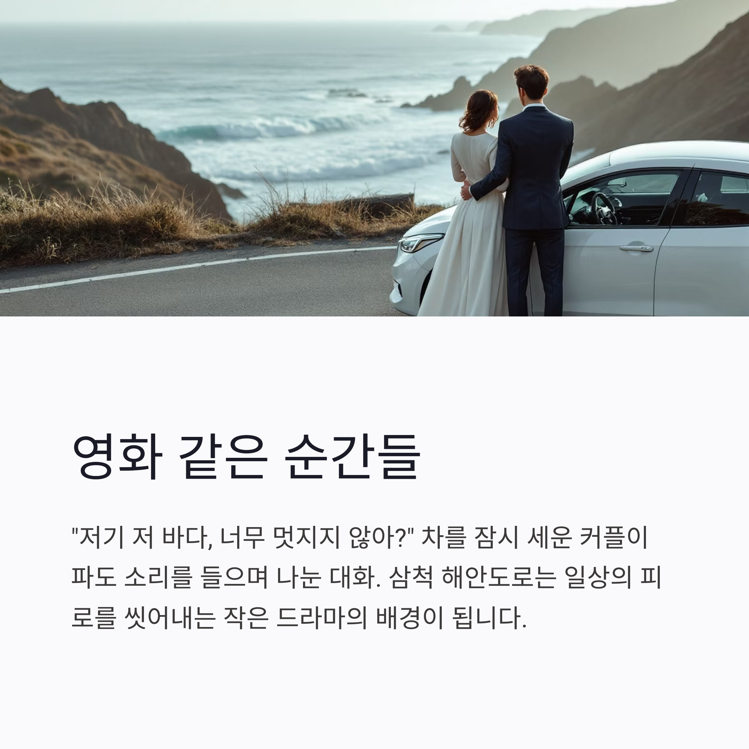 삼척 해안도로는 일상의 피로를 씻어내는 작은 드라마의 배경이 됩니다.
