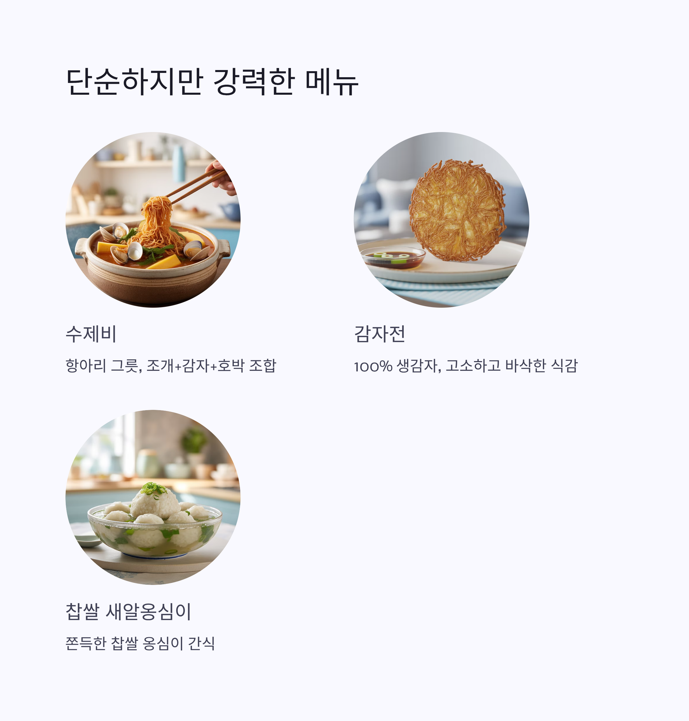| 찹쌀 새알옹심이 | 쫀득한 찹쌀 옹심이로 간식 혹은 사이드로 인기 |