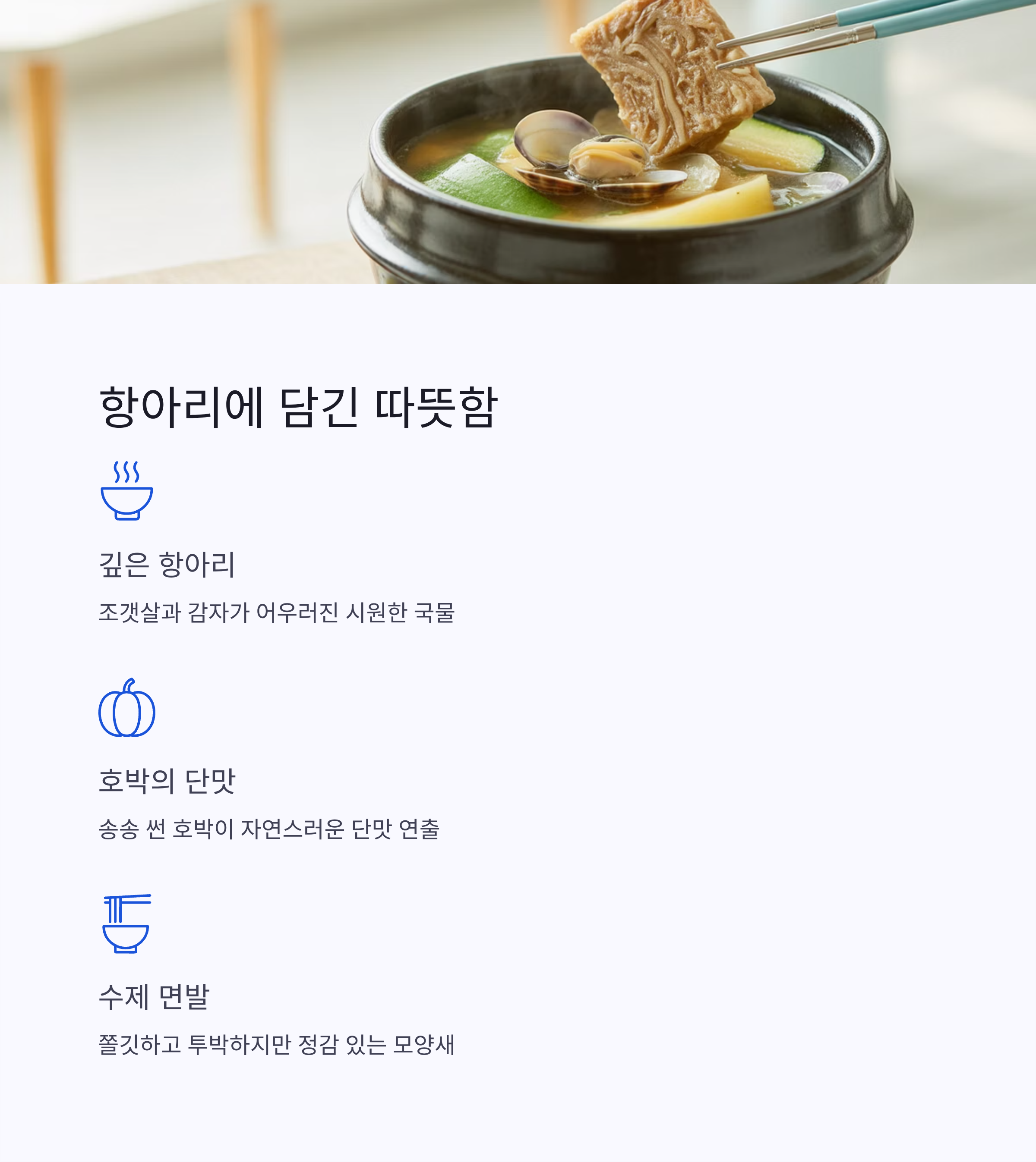 | 수제비 | 항아리 그릇, 조개+감자+호박 조합 국물 |