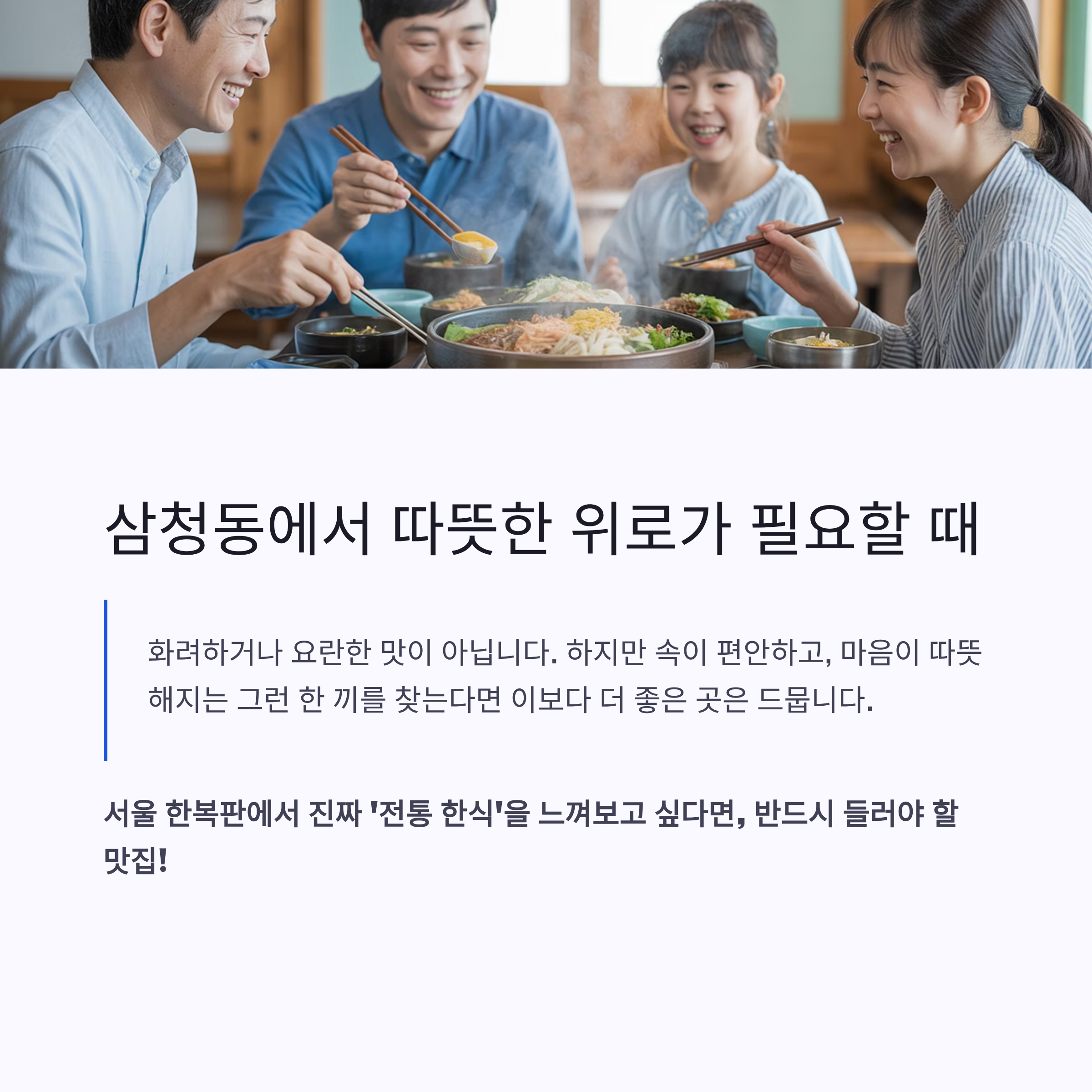 | 경복궁 | 도보 10분 | 궁 투어 후 따뜻한 한 끼로 마무리 |