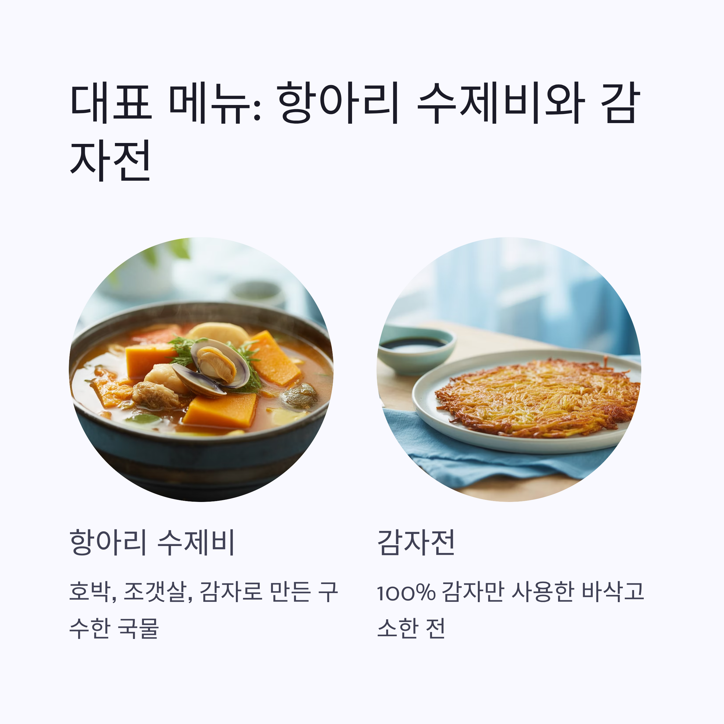 밀가루를 전혀 섞지 않고 감자만 갈아내어 바삭하고 고소한 식감을 자랑하죠. 단순하지만 깊은 맛 덕분에 수제비와 함께 꼭 주문하는 메뉴로 꼽힙니다.