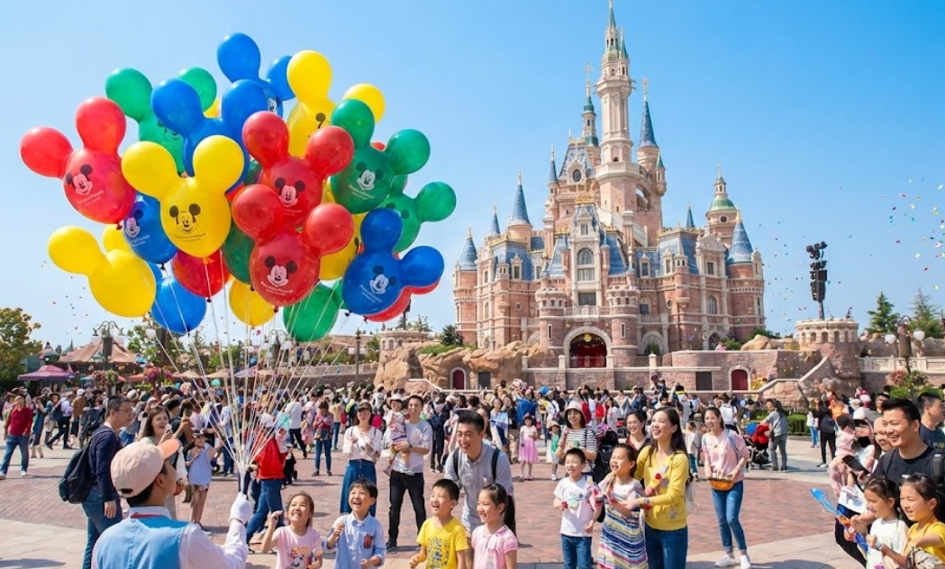 상하이 디즈니랜드의 거대한 성과 화려한 퍼레이드 장면