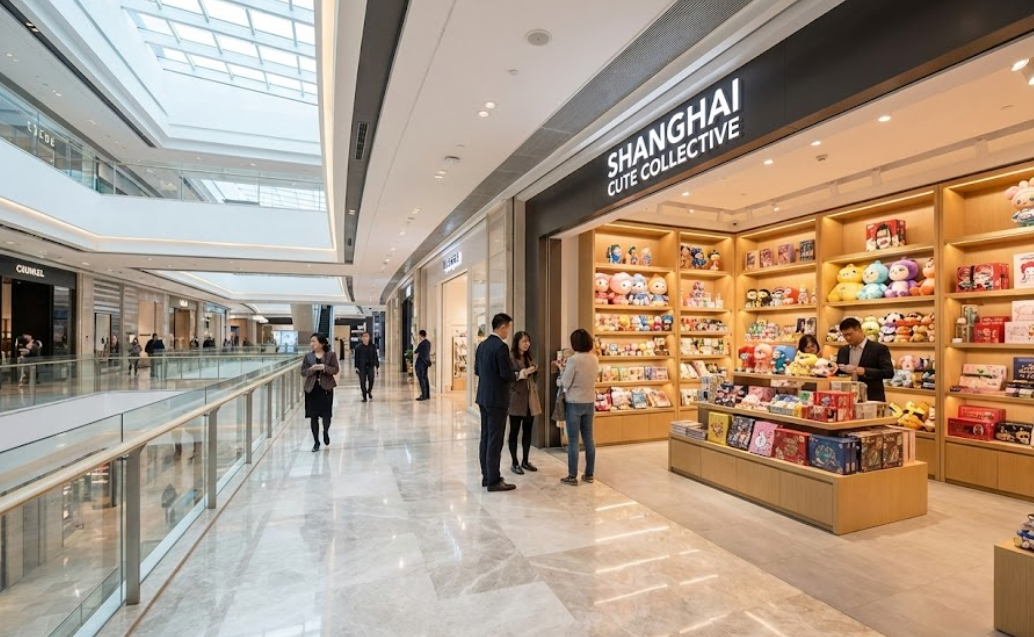 상하이의 현대적인 쇼핑몰 내부와 다양한 기념품