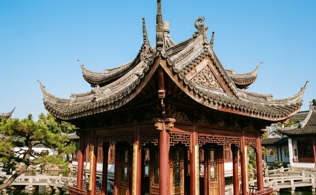 예원의 붉은색 목조 건물들과 연못 위의 다리 풍경