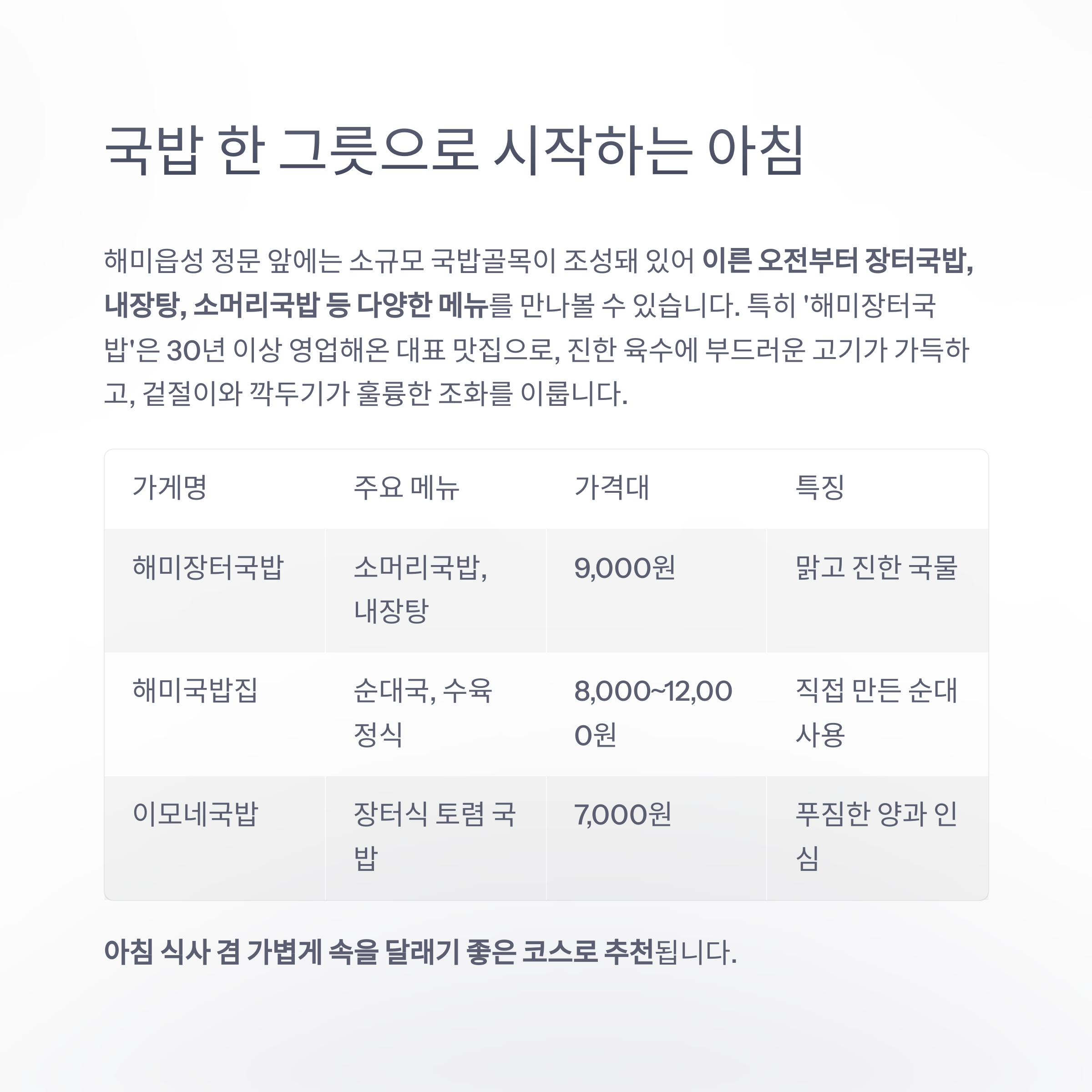 | 오전 10시 | 해미장터국밥 | 든든한 국밥으로 시작 |