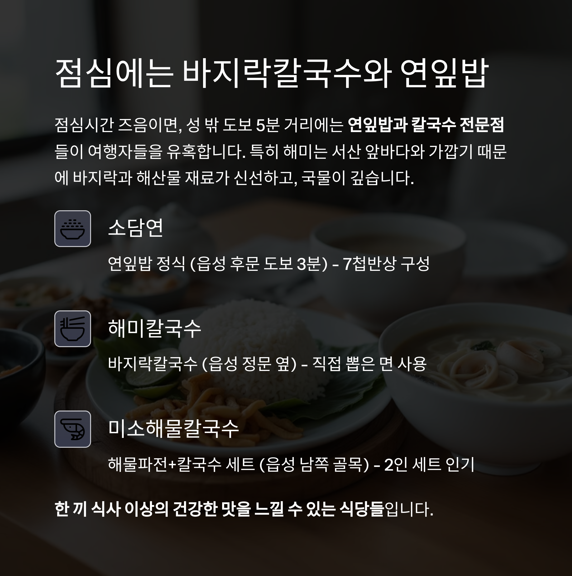 | 미소해물칼국수 | 해물파전+칼국수 세트 | 읍성 남쪽 골목 | 2인 세트 인기 |
