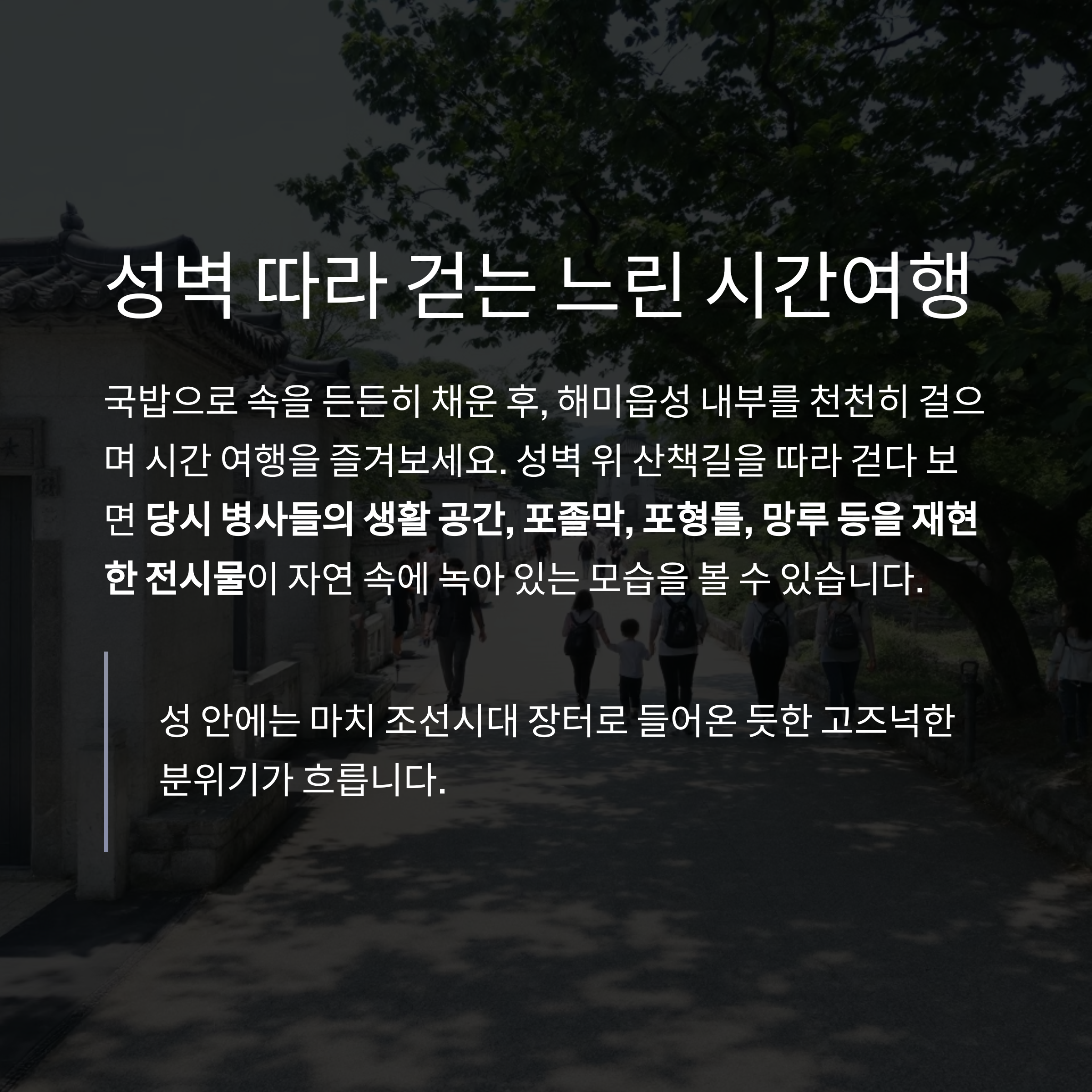 지금은 성벽 산책과 전통복 체험, 사진 명소로도 인기가 높습니다.