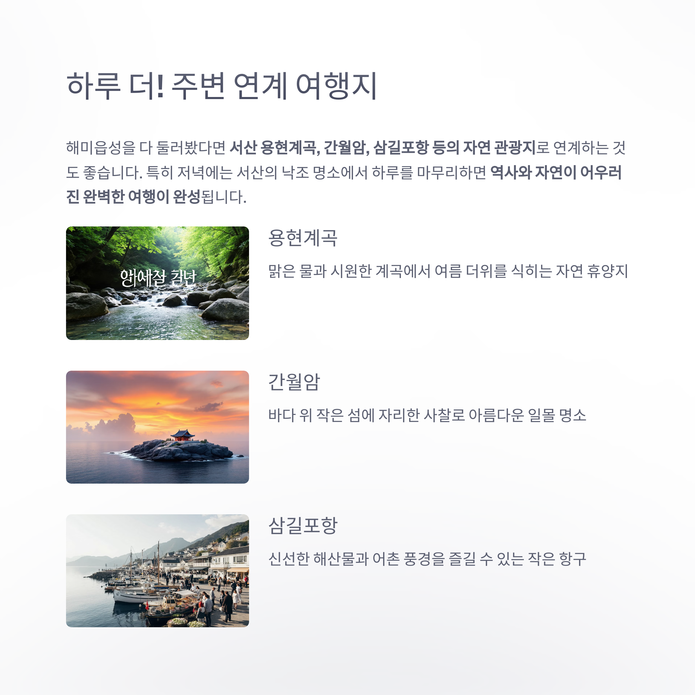 서산 용현계곡, 간월암, 삼길포항 등의 자연 관광지로 연계하는 것도 좋습니다.