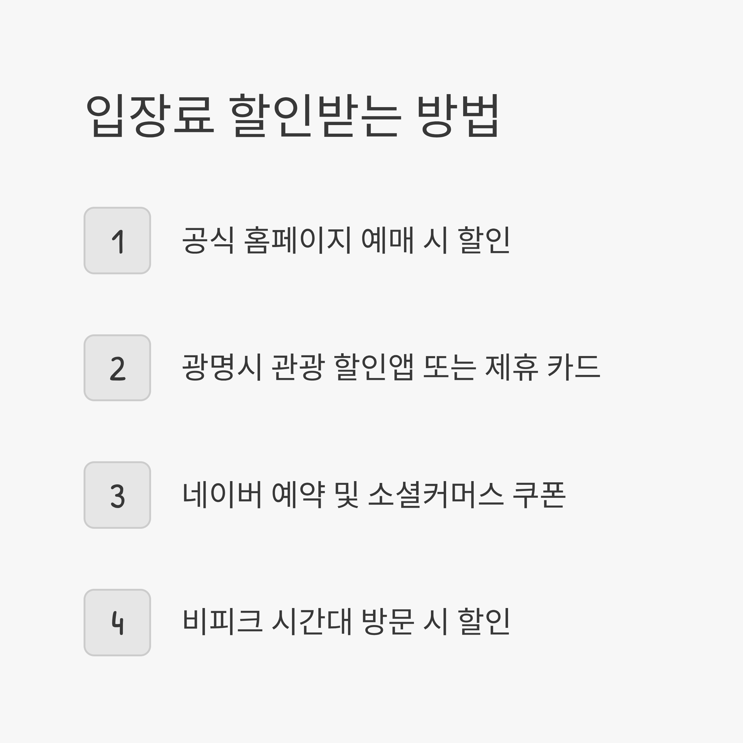 - 광명시 공식 관광 할인앱 또는 제휴 카드 활용