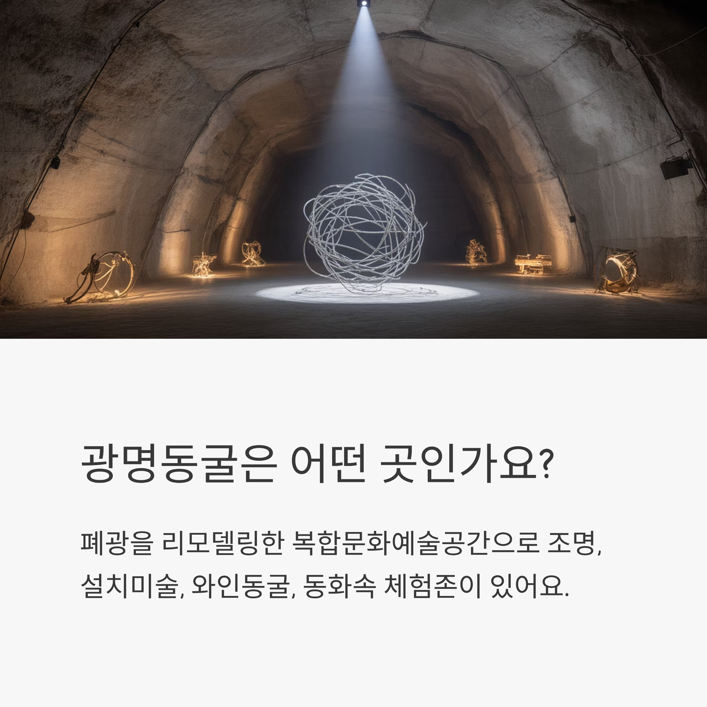 광명동굴은 경기도 광명시에 위치한 폐광을 리모델링한 복합문화예술공간이에요.