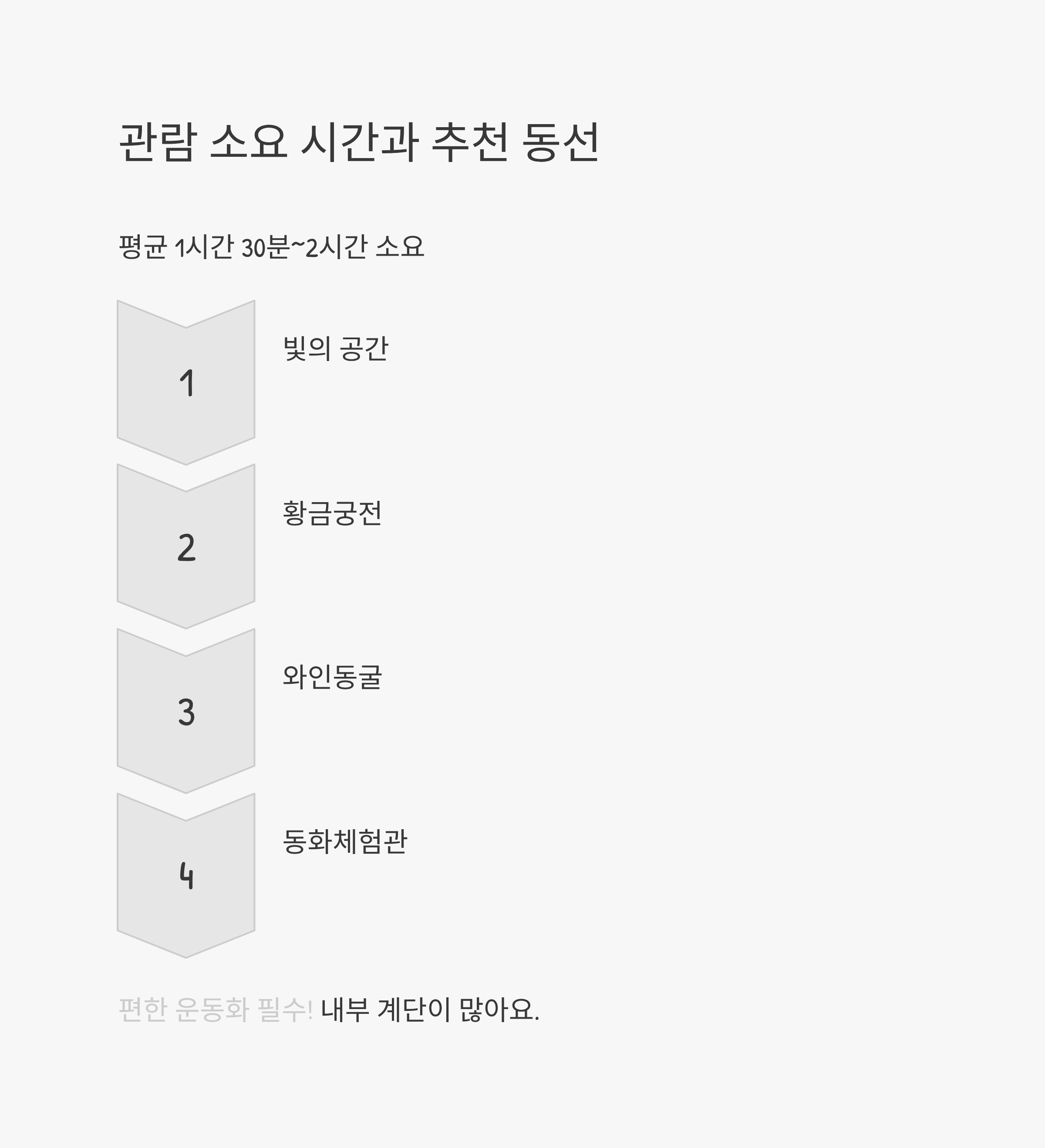빛의 공간 → 황금궁전 → 와인동굴 → 동화체험관 → 미디어아트 → 황금폭포