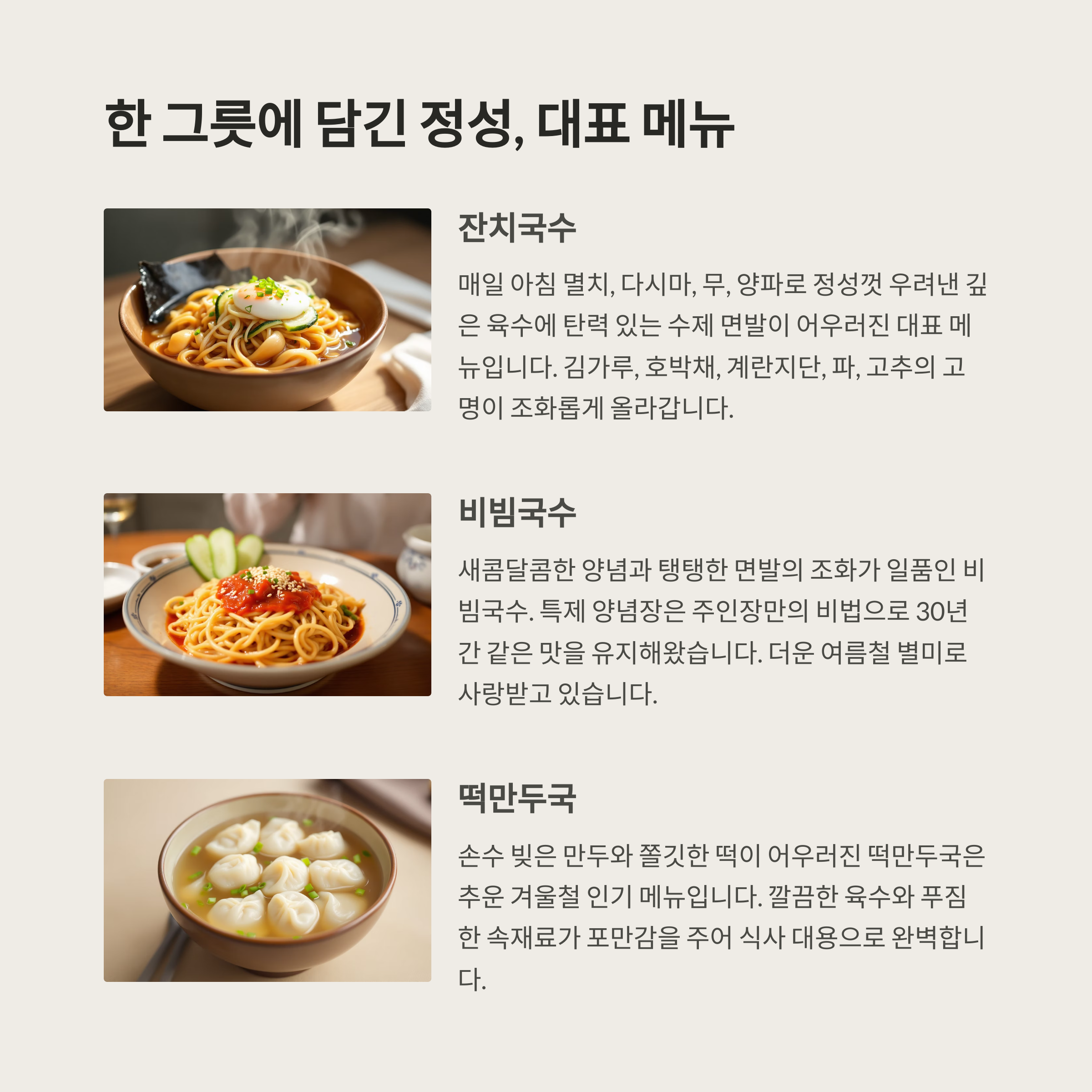 면발은 손으로 뽑아 탄력과 부드러움을 동시에 갖추고 있어 국물과 잘 어우러집니다.
