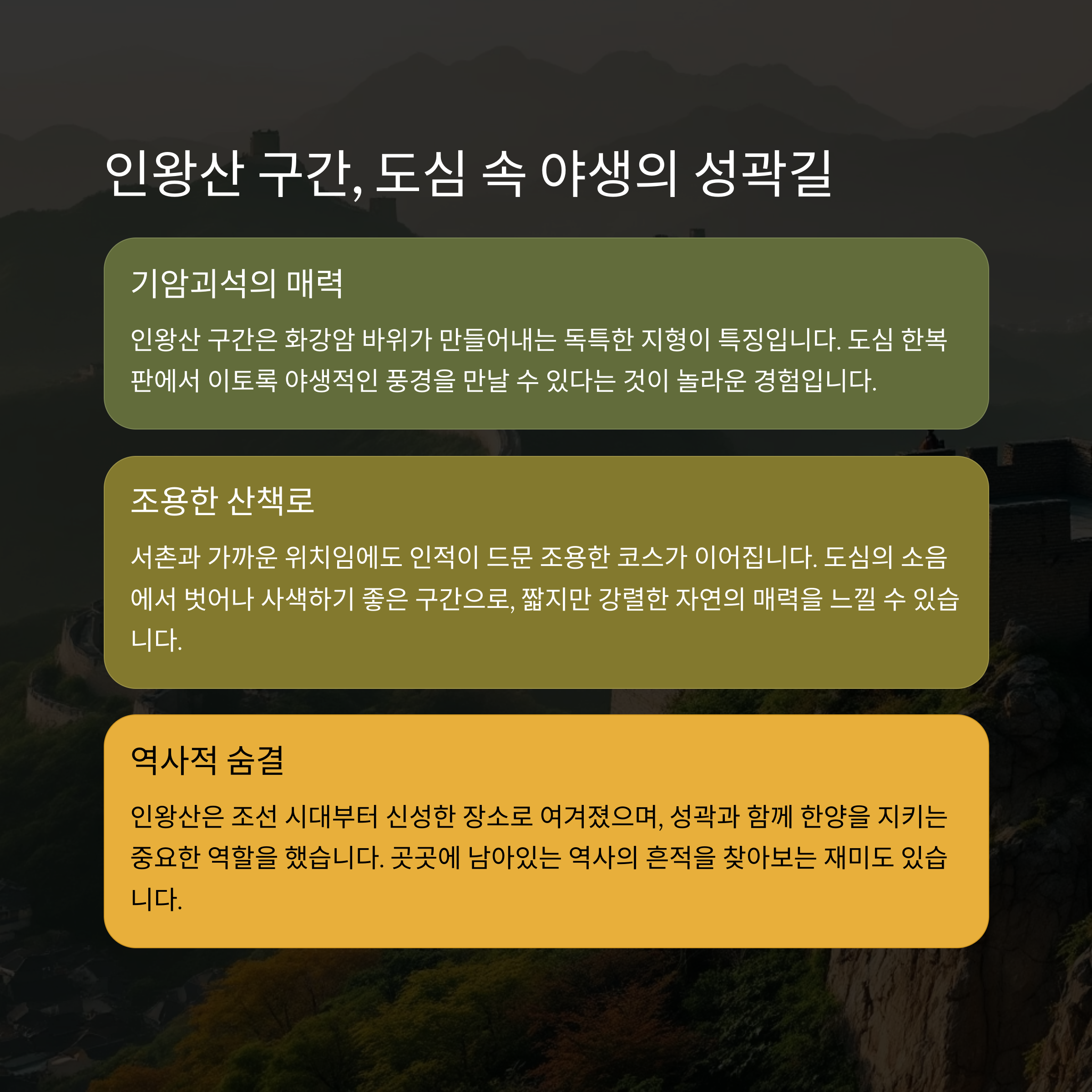 인왕산 구간은 험준한 암벽과 숲으로 이루어져 있습니다.