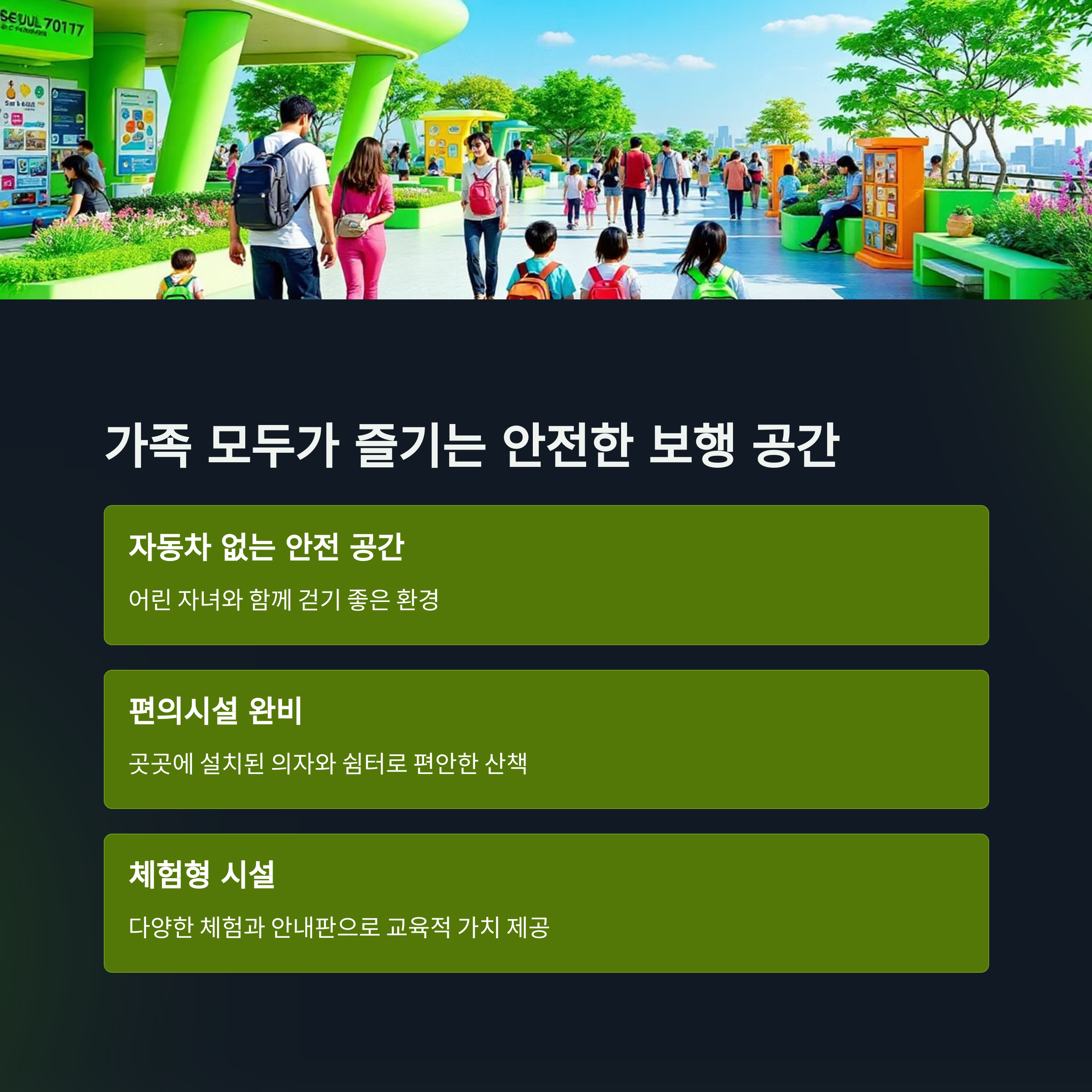 서울로 7017은 자동차가 다니지 않는 안전한 보행 공간이라 어린 자녀와 함께 걷기에도 좋습니다.