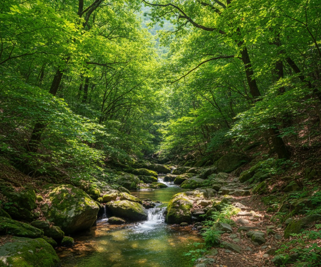 오서산 등산로 입구의 울창한 숲길과 맑은 계곡