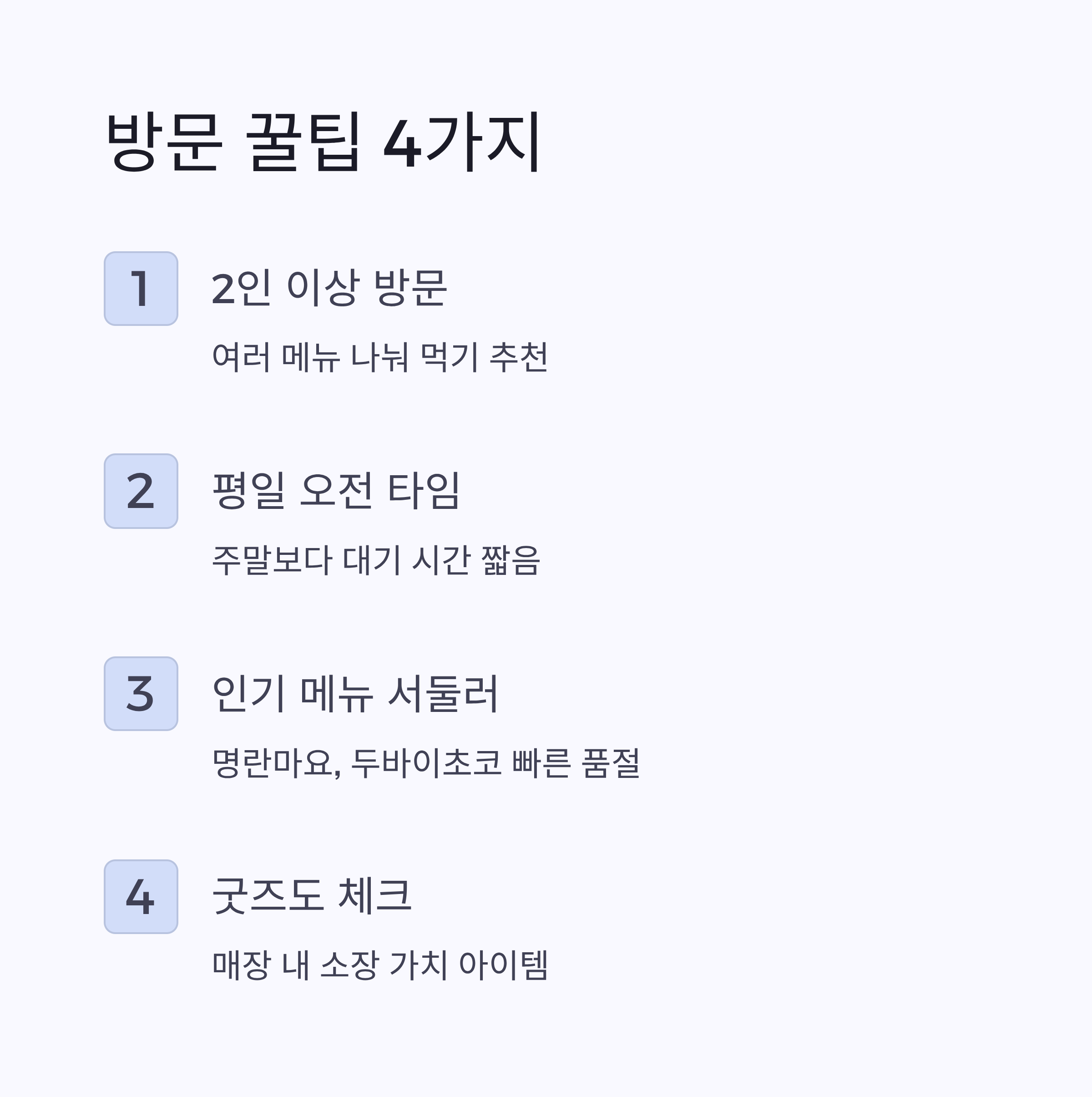 - 최소 2인 이상 방문하여 여러 메뉴를 나눠 먹는 것이 가장 효율적입니다.