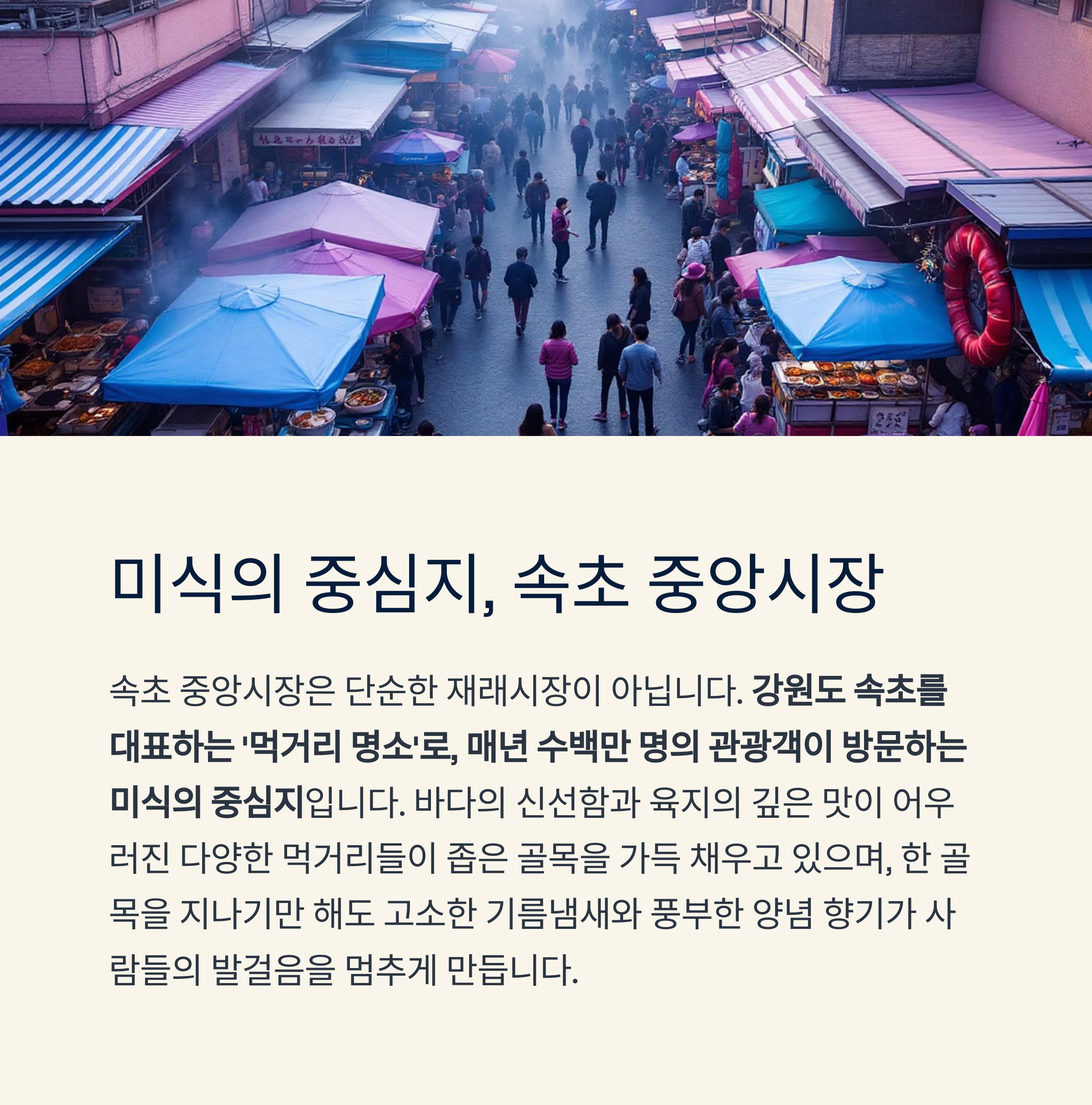 강원도 속초를 대표하는 '먹거리 명소'로, 매년 수백만 명의 관광객이 방문하는 미식의 중심지입니다.