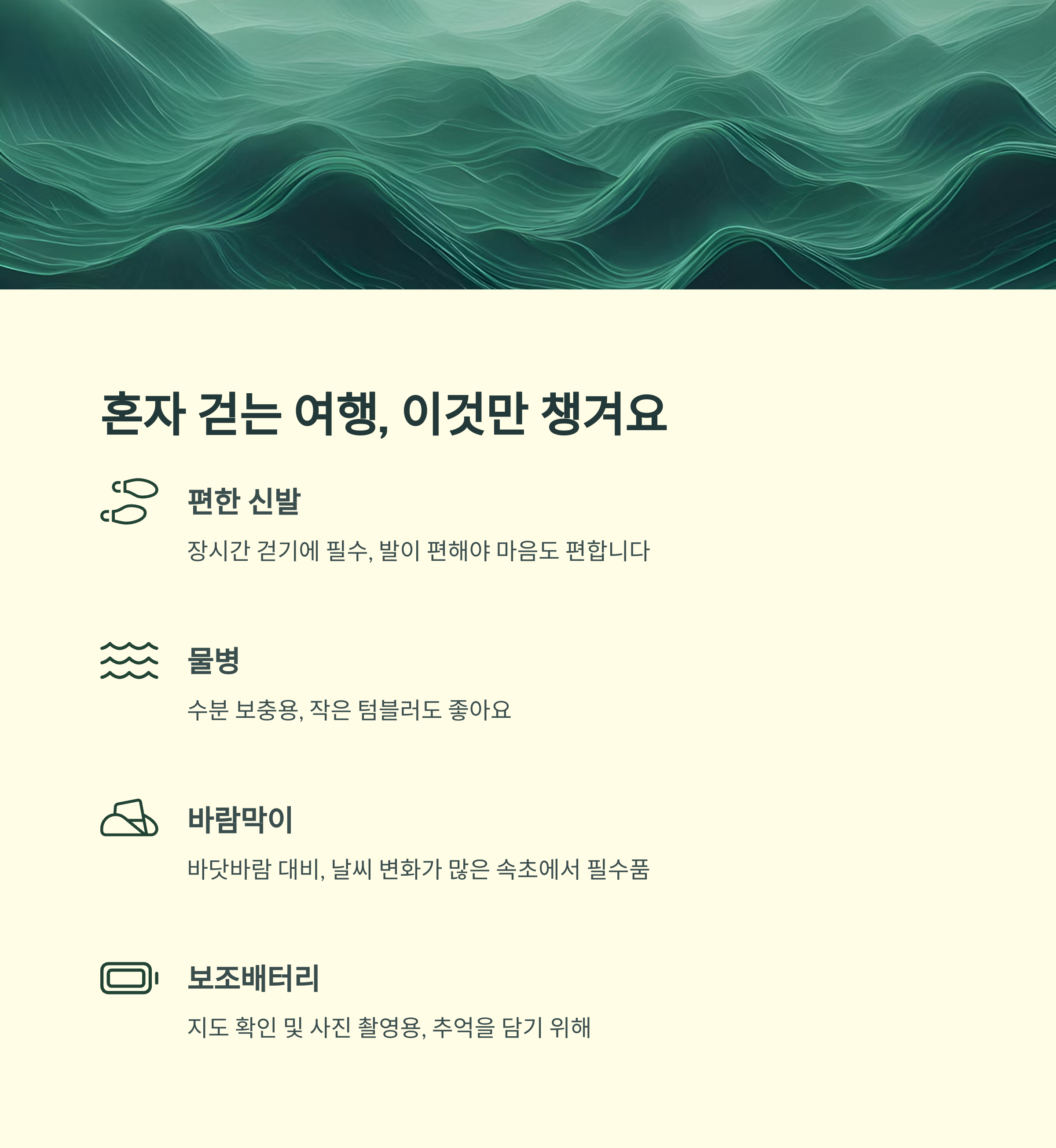 걷기 여행 전에는 다음의 기본 준비물을 챙기세요.