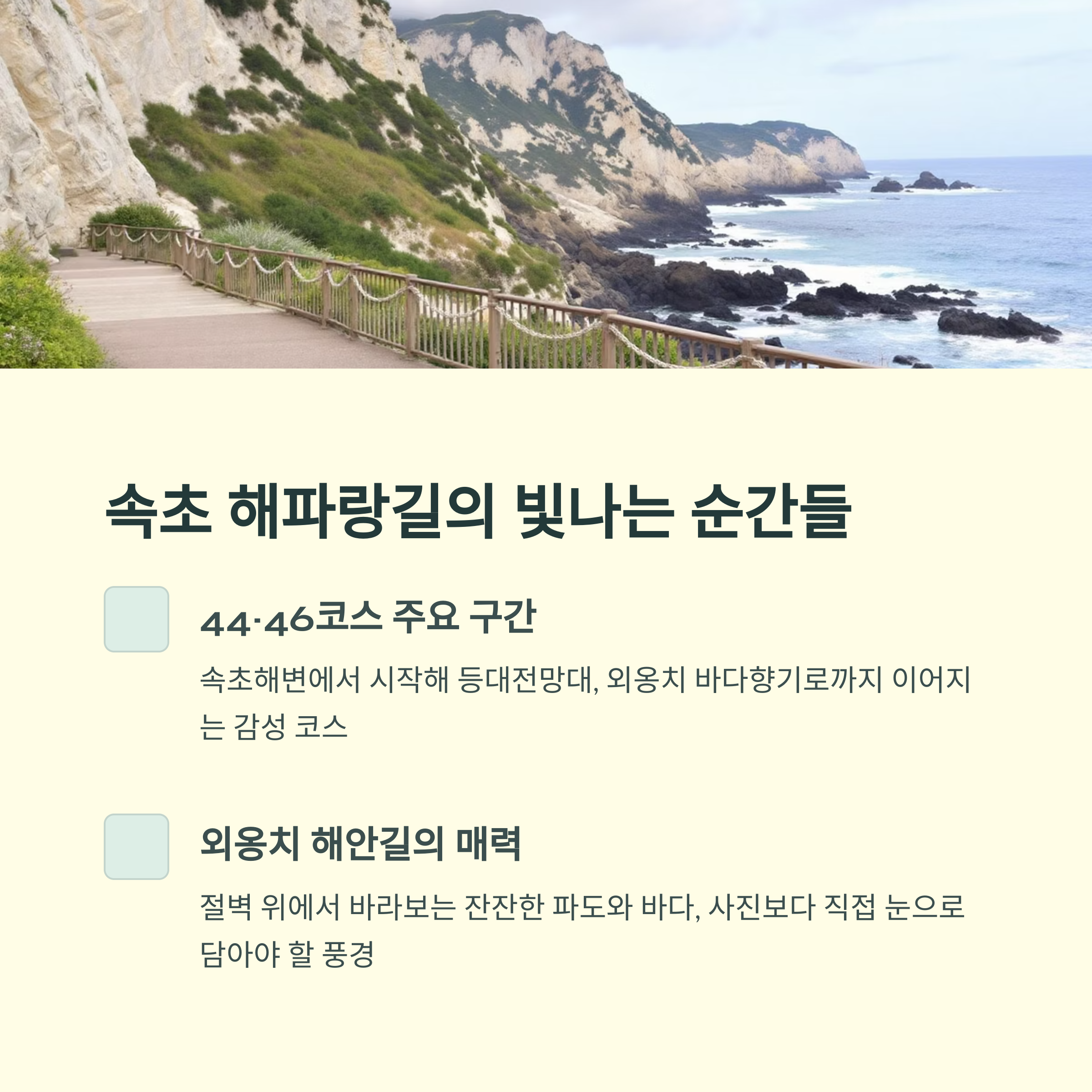 주요 지점은 속초해변, 등대전망대, 외옹치 바다향기로 등으로 이어집니다.