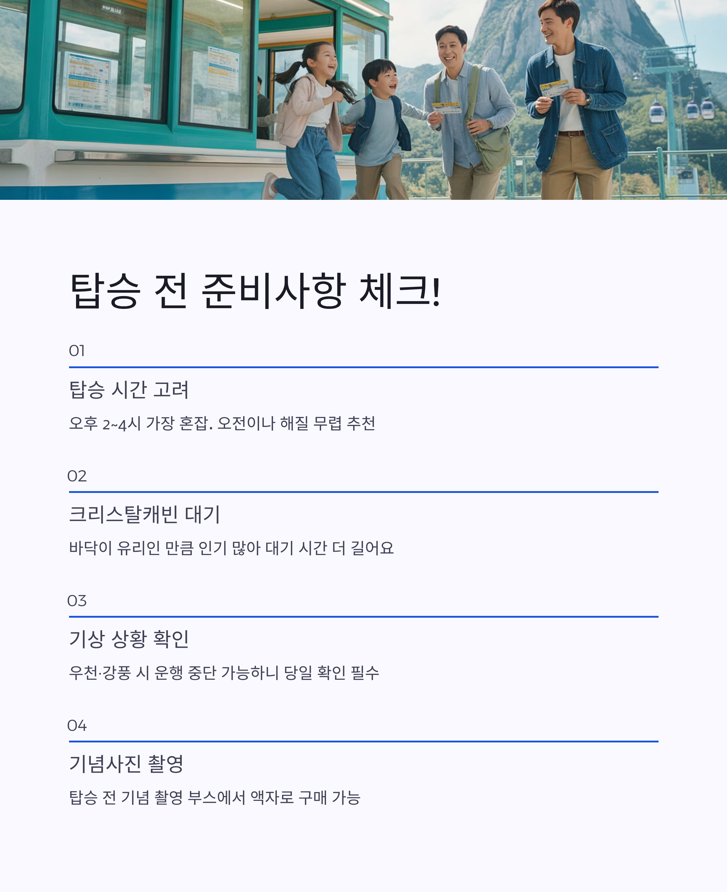 - 탑승 대기 시간 고려: 오후 2~4시가 가장 혼잡하니, 오전이나 해질 무렵 추천