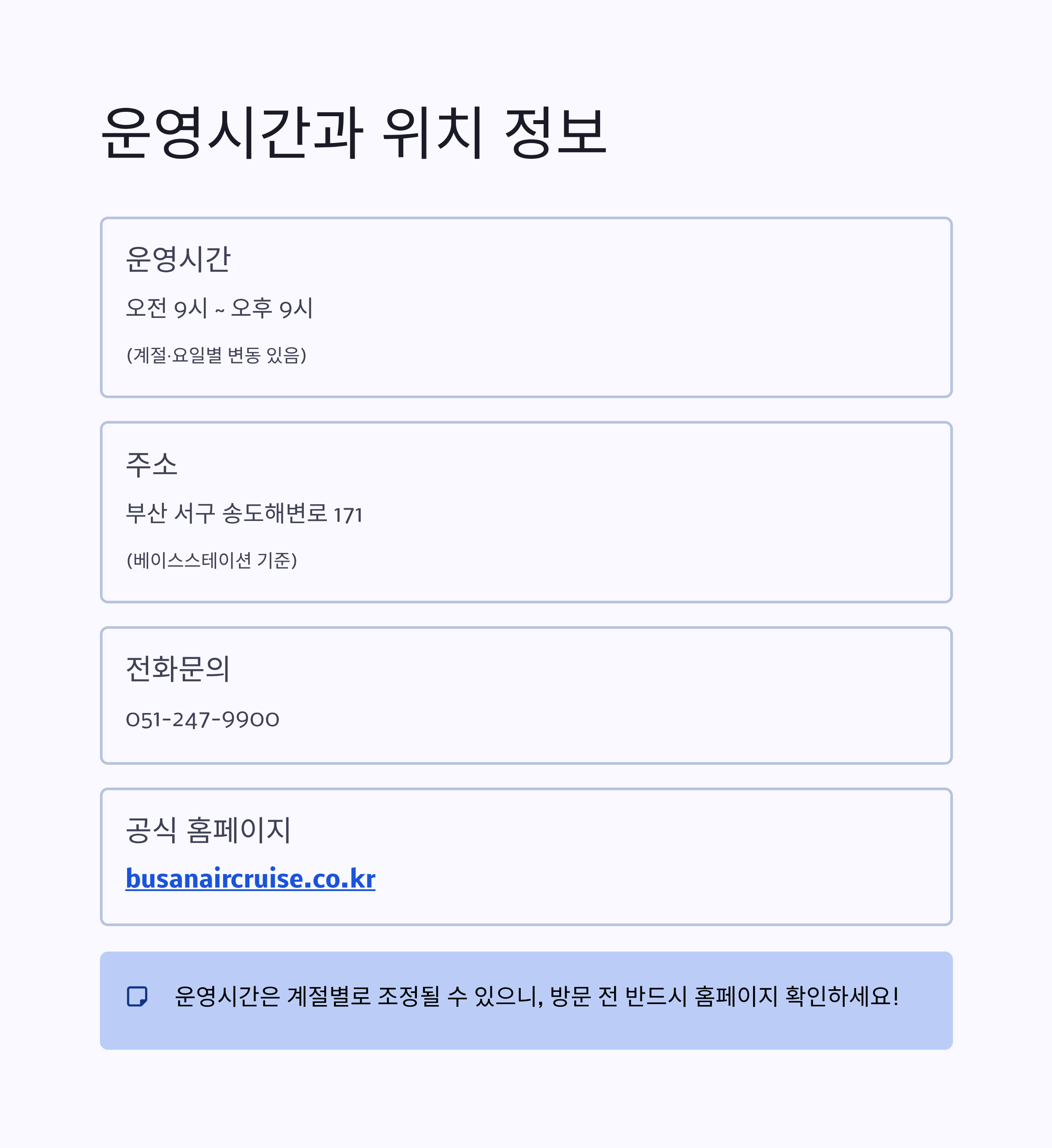 | 공식 홈페이지 | https://www.busanaircruise.co.kr/ |