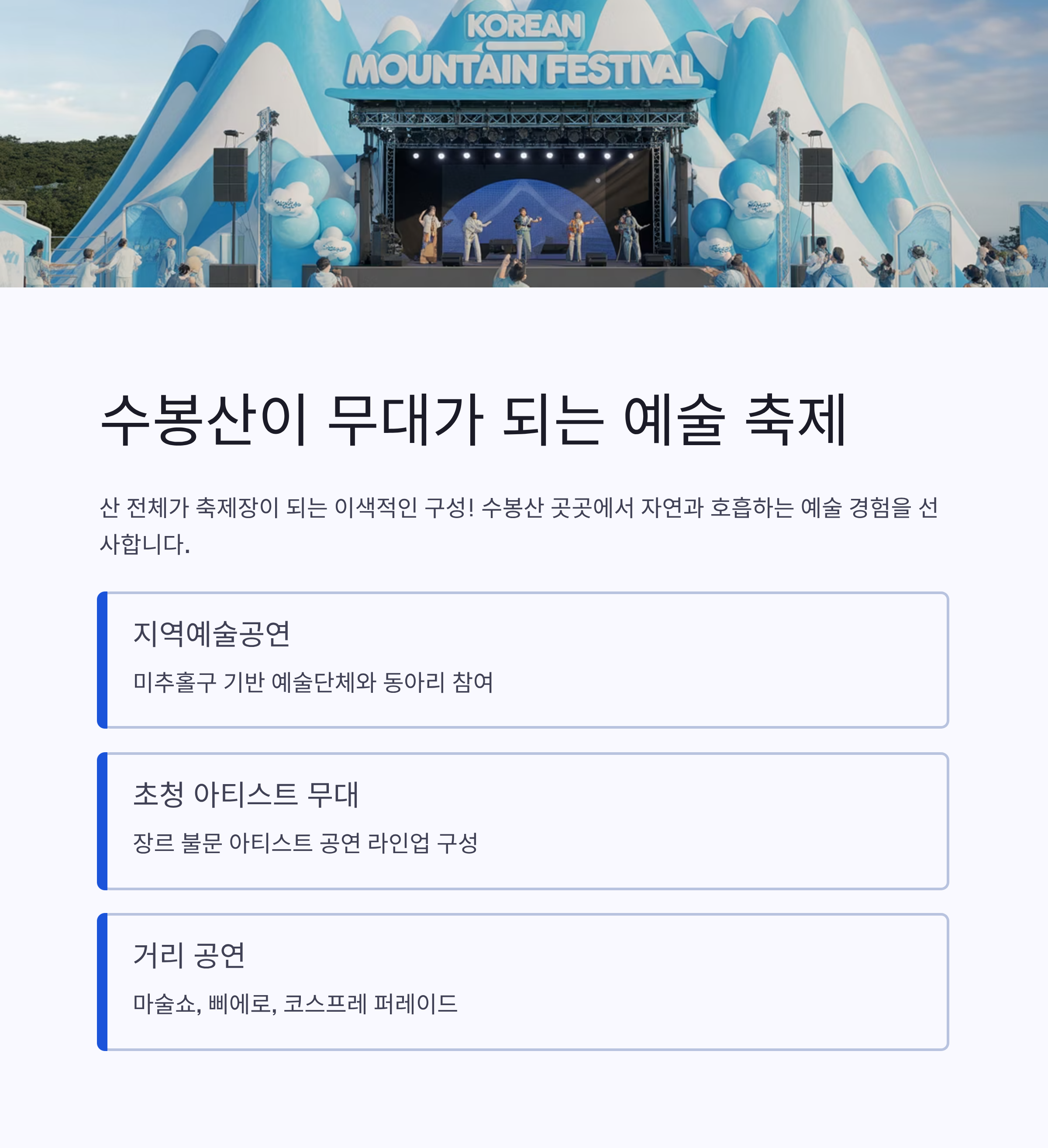 | 초청 아티스트 무대 | 장르 불문 아티스트 공연 라인업 구성 |
