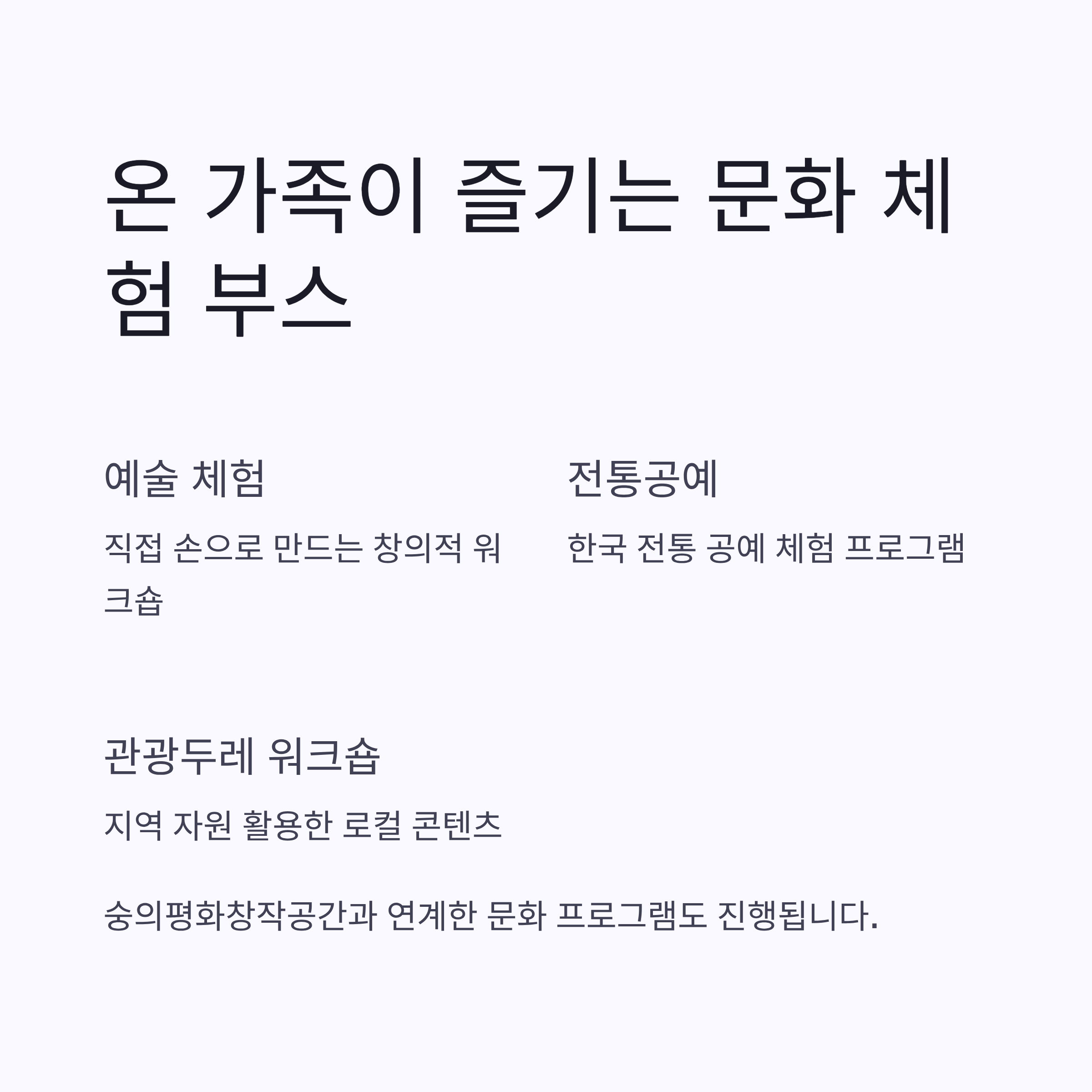 예술 체험, 전통공예, 관광두레 연계 워크숍 등