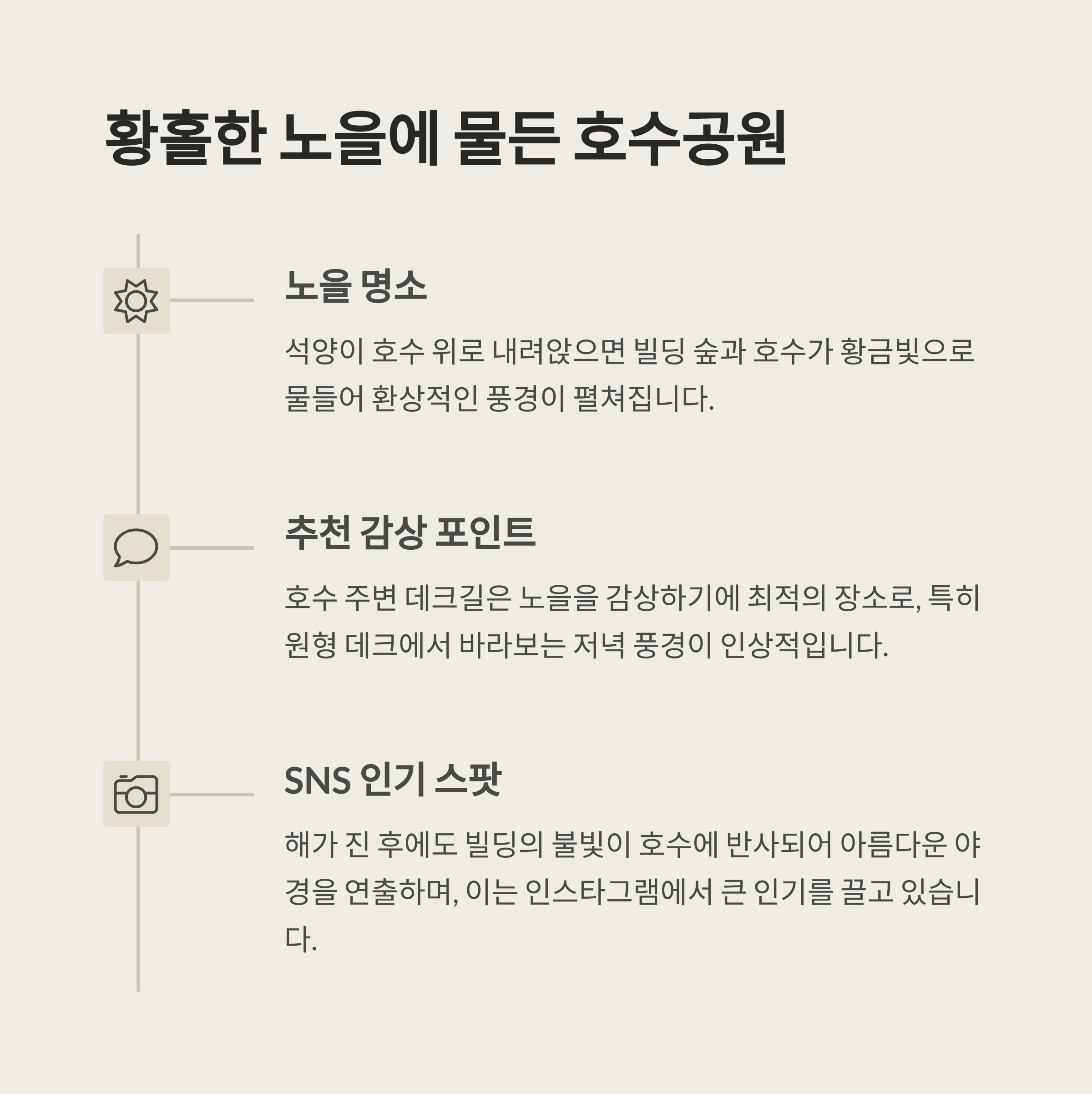 "호수 위로 지는 노을과 조명이 어우러진 풍경이 정말 환상적이에요"