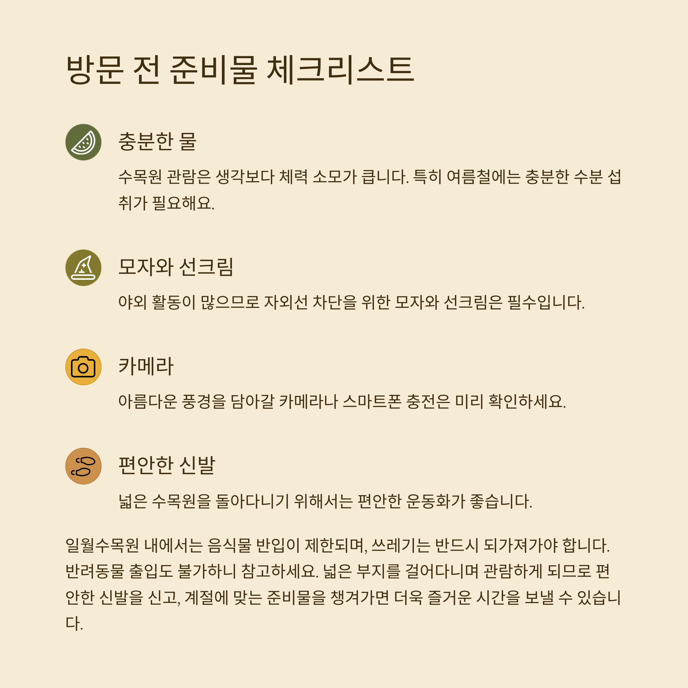 일월수목원 내 음식물 반입은 제한되며, 쓰레기는 반드시 되가져가야 합니다. 반려동물 출입은 불가하므로 참고하시기 바랍니다. 계절에 따라 햇빛이 강한 시기에는 모자, 선크림, 물 등을 준비하면 더욱 쾌적한 관람이 가능합니다.