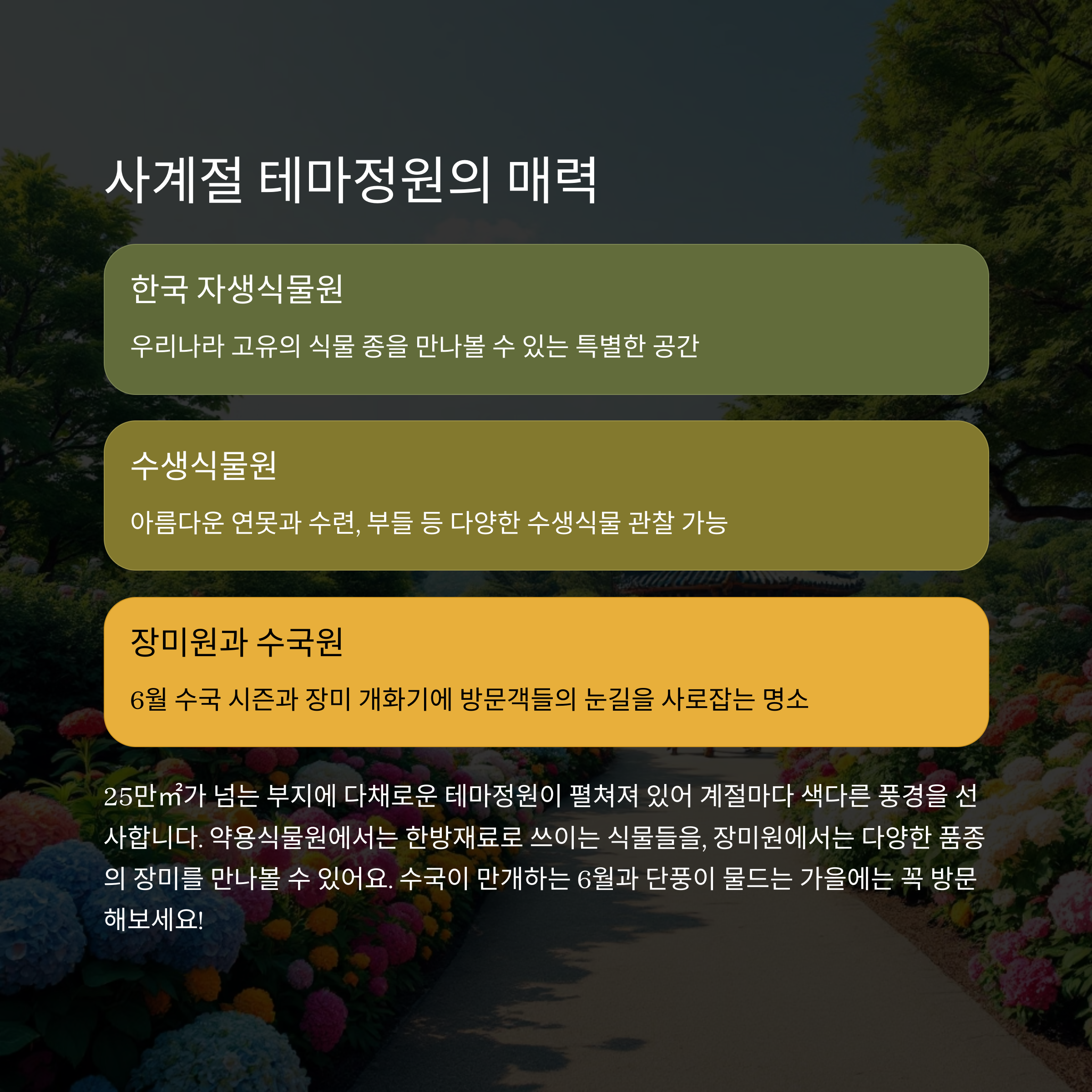 수목원 곳곳에 조성된 산책로는 걷기만 해도 마음이 정화되는 느낌을 줍니다. 나무 터널, 연못, 전망대 등 다양한 구간이 있어 지루할 틈이 없습니다. 특히 중앙광장에서는 아름다운 수목원 전경을 한눈에 내려다볼 수 있어 휴식과 사진 촬영을 동시에 즐길 수 있습니다.