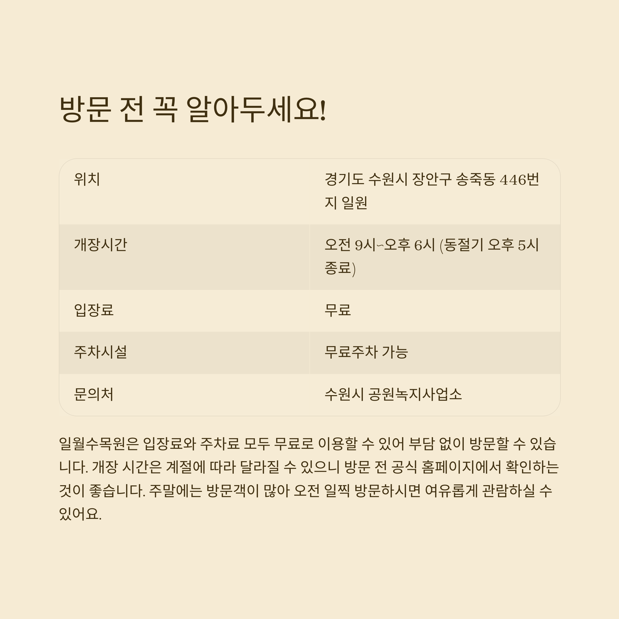 수원시에 위치한 일월수목원은 도심 속에서 쉽게 자연을 체험할 수 있는 힐링 공간으로 각광받고 있습니다. 다양한 식물 테마원과 넓은 산책로, 교육 프로그램까지 갖춰 남녀노소 누구나 즐길 수 있는 명소입니다. 오늘은 수원 일월수목원의 매력과 방문 시 알아두면 좋은 팁을 자세히 소개해 드리겠습니다.