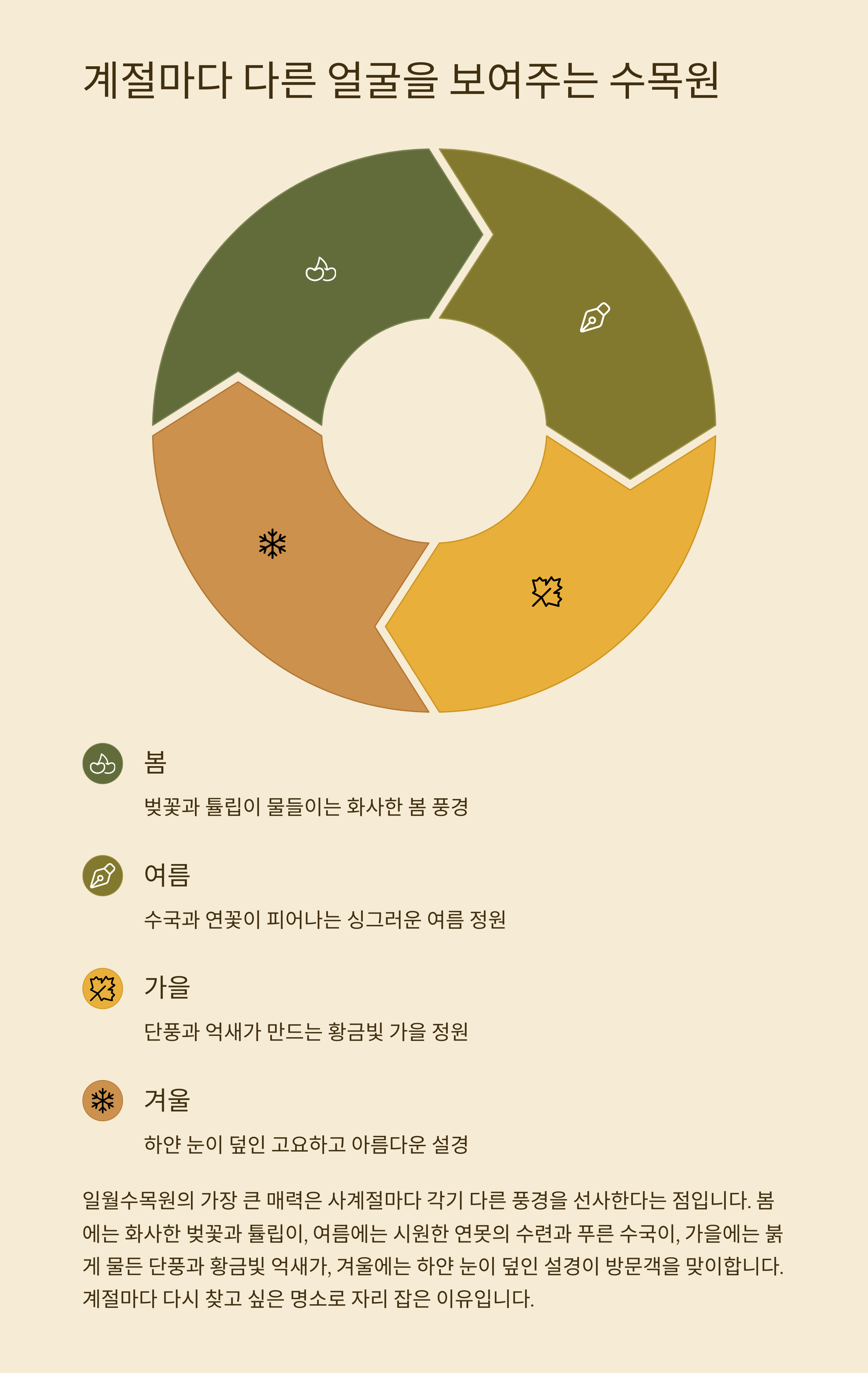 수원 일월수목원은 사계절마다 각기 다른 풍경으로 방문객을 맞이합니다. 봄의 벚꽃과 튤립, 여름의 수국과 연꽃, 가을의 단풍과 억새, 겨울의 설경이 그 예입니다. 이 때문에 계절마다 다시 찾고 싶은 명소로 자리 잡았습니다.