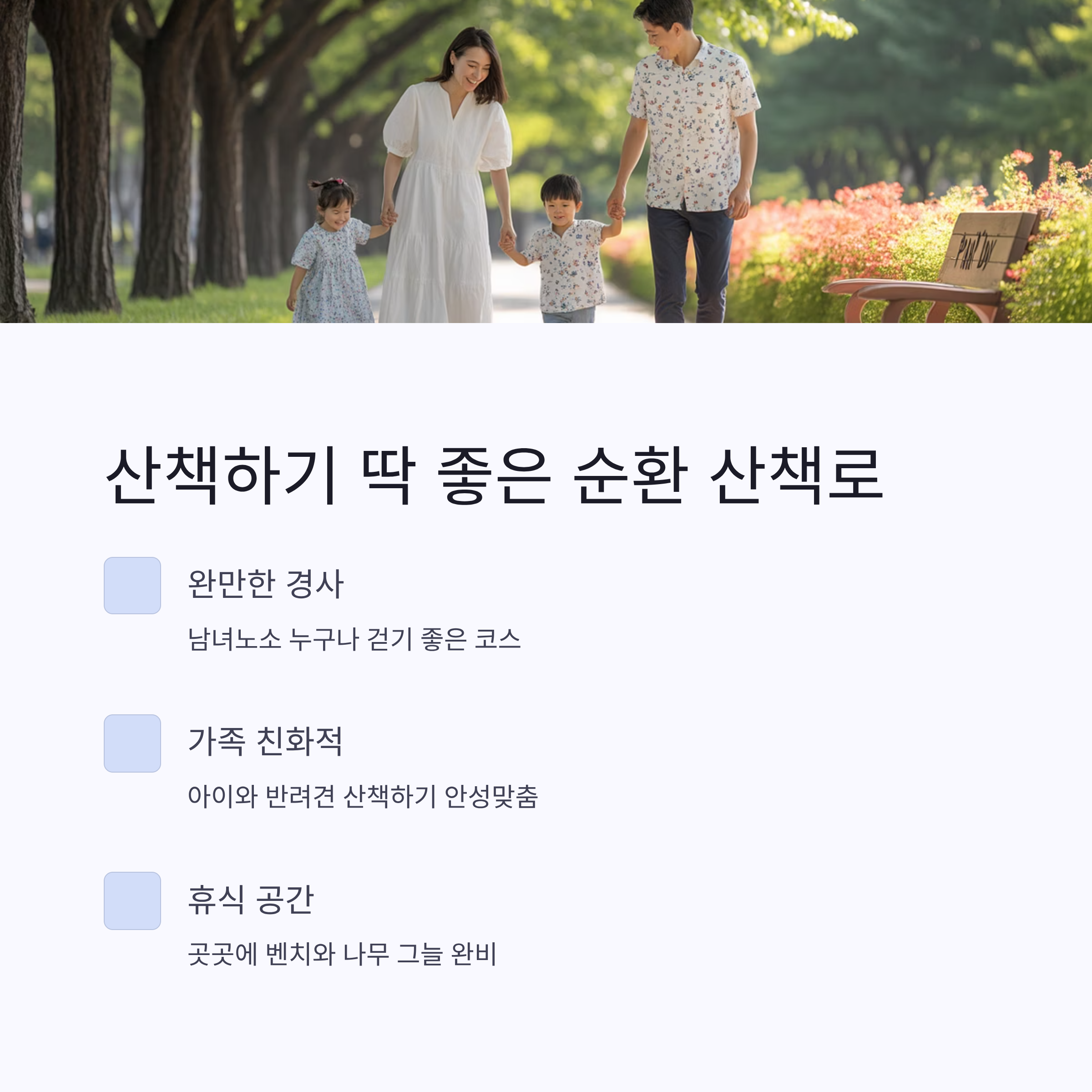 공원을 한 바퀴 도는 산책로는 완만한 경사로 되어 있어 남녀노소 누구나 걷기 좋아요.