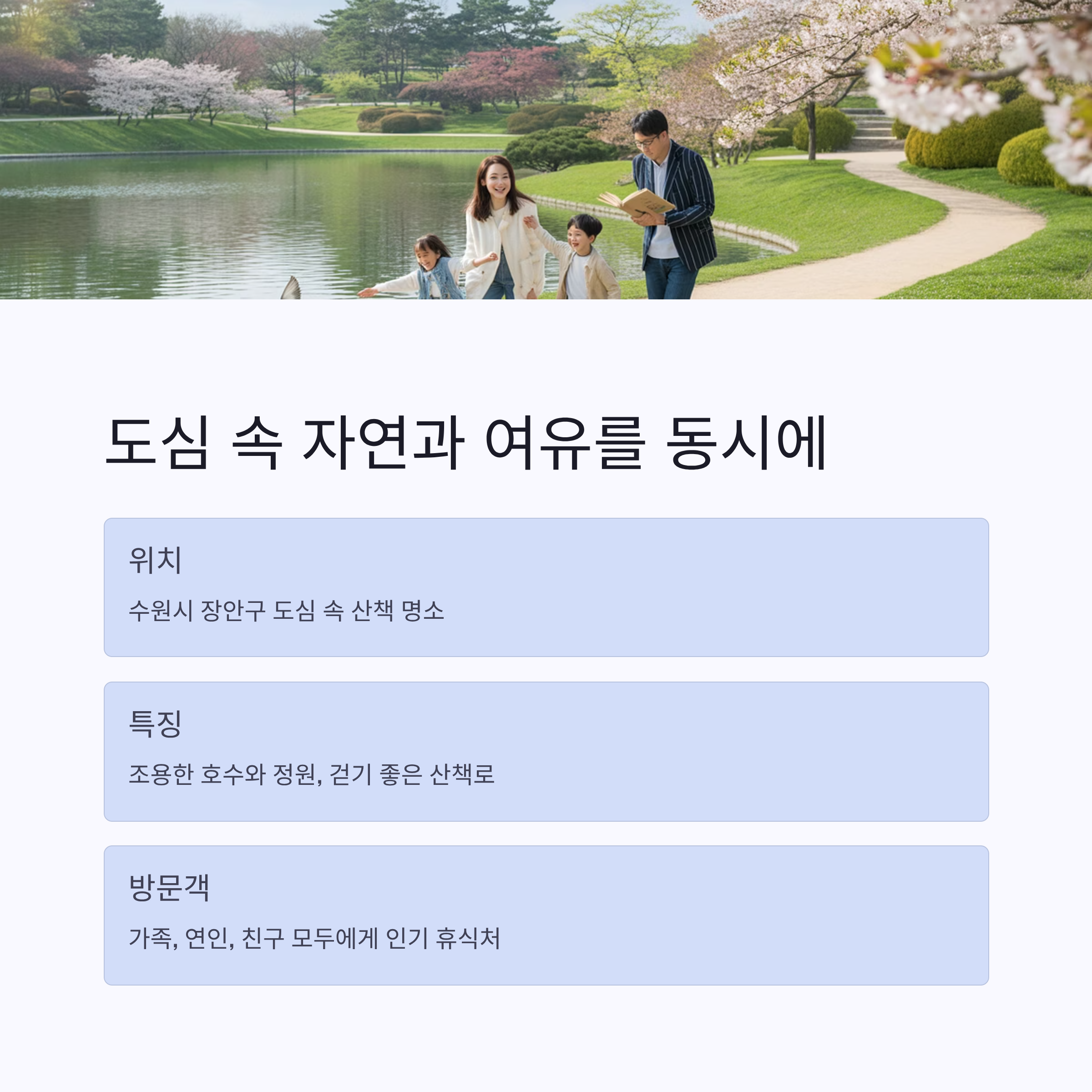 수원시 장안구에 위치한 만석공원은 도심 속에서 자연과 여유를 동시에 느낄 수 있는 산책 명소입니다. 복잡한 일상에서 벗어나 조용한 호수와 정원, 그리고 걷기 좋은 산책로가 어우러진 이곳은 가족, 연인, 친구 모두에게 인기 있는 휴식처로 사랑받고 있습니다. 오늘은 만석공원의 매력을 낱낱이 소개해드릴게요.