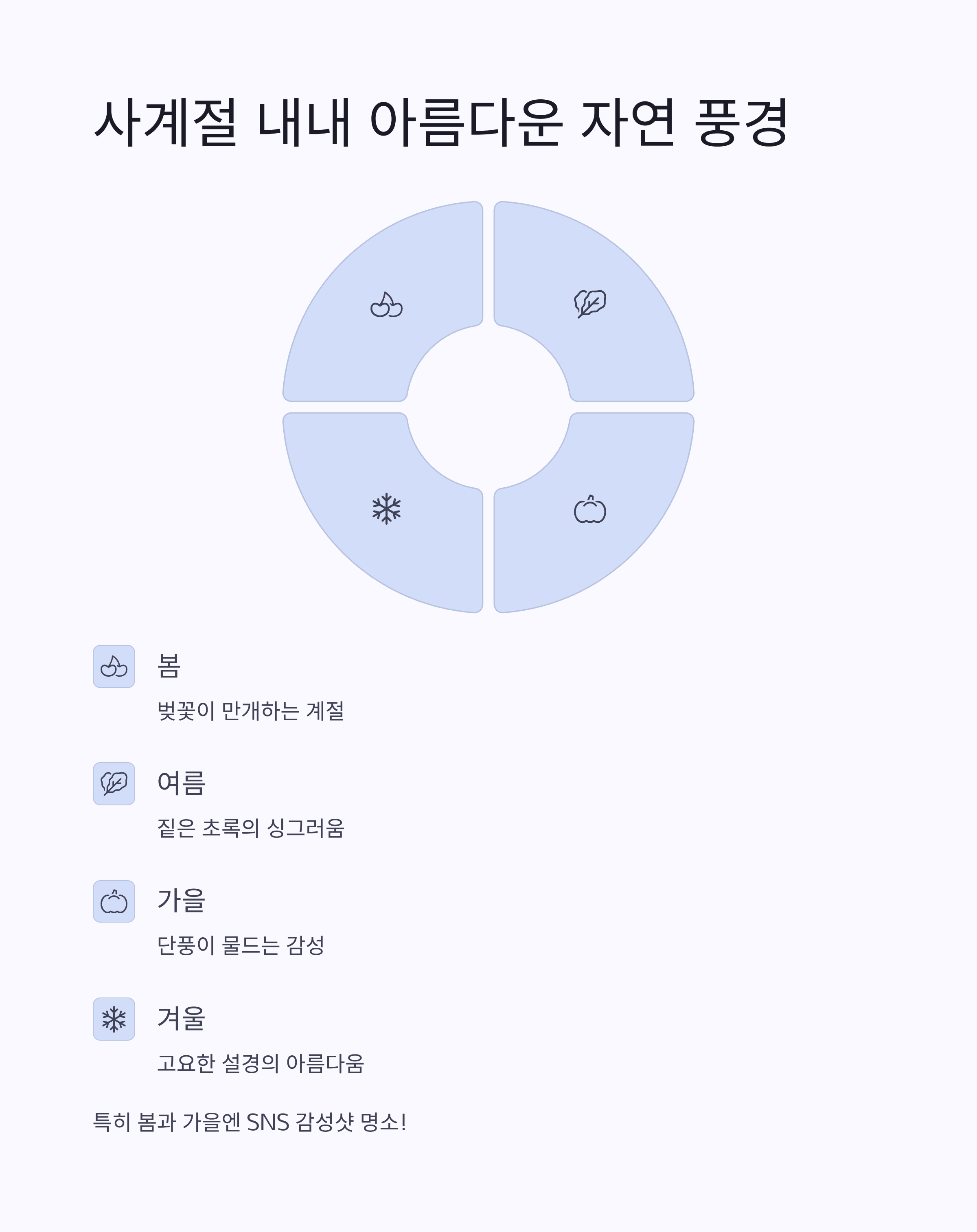 봄에는 벚꽃, 여름엔 짙은 초록, 가을엔 단풍, 겨울엔 고요한 설경.