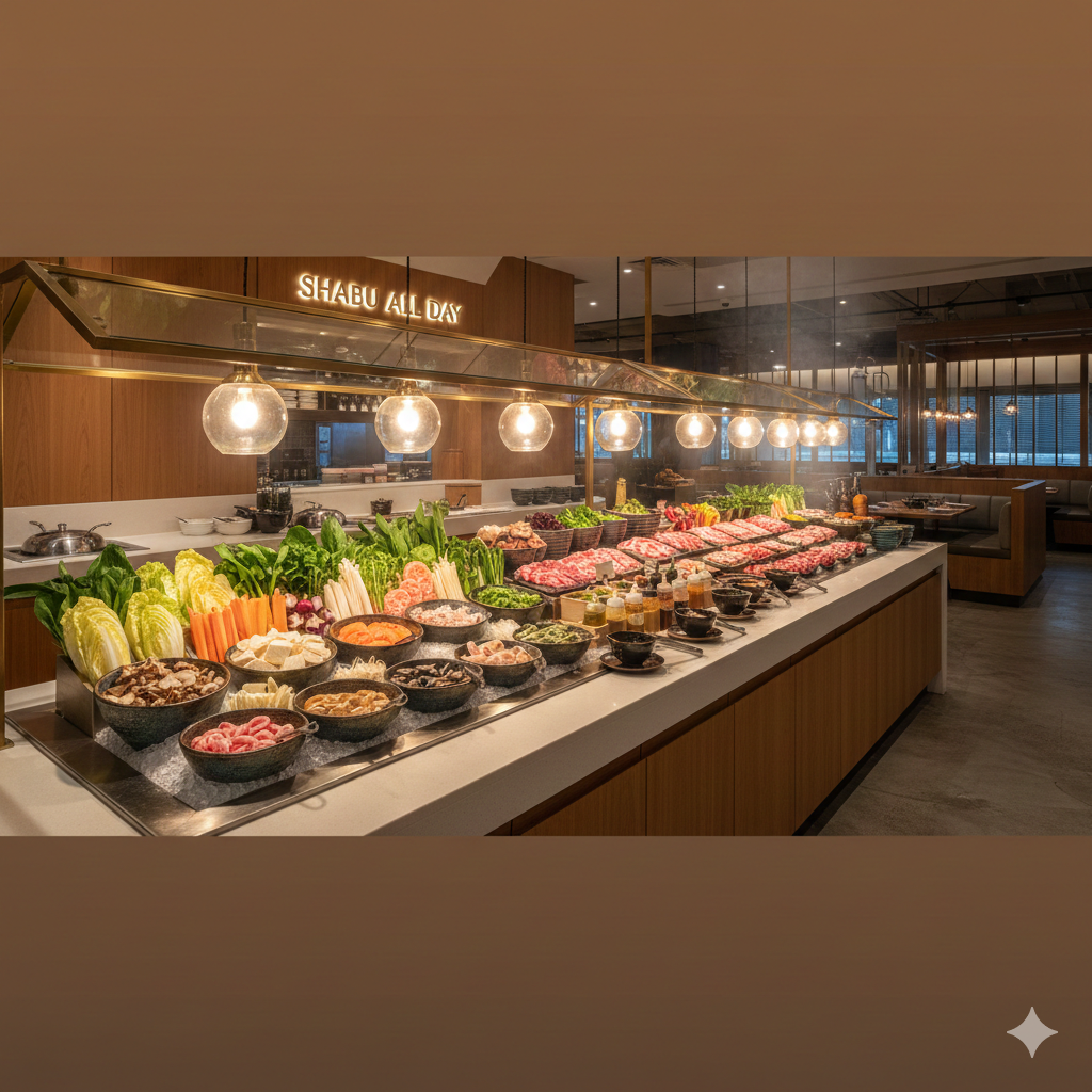 ✅ 미친 가성비: 평일 런치 기준 2만 원대에 샤브+다양한 뷔페 메뉴 무제한.