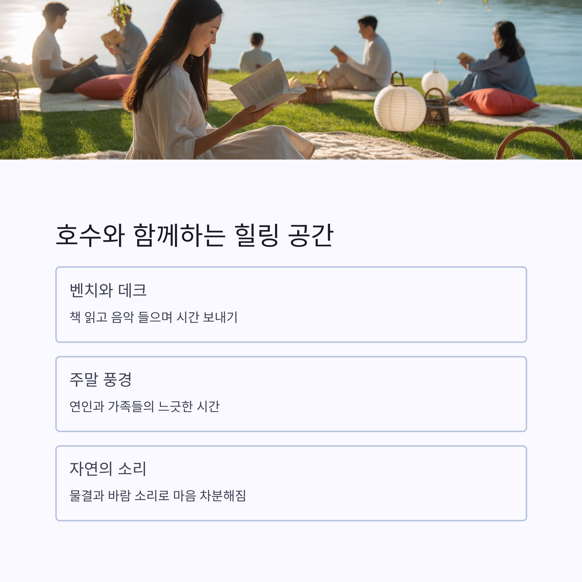 호숫가에는 벤치와 데크가 있어 앉아 책을 읽거나 음악을 들으며 시간을 보내는 사람들도 많아요. 특히 주말에는 연인이나 가족 단위 방문객들이 호수 주변에 모여 느긋한 시간을 보내는 모습을 쉽게 볼 수 있죠. 호수 물결과 바람 소리가 어우러지면서 마음이 차분해지는 경험을 하게 돼요.