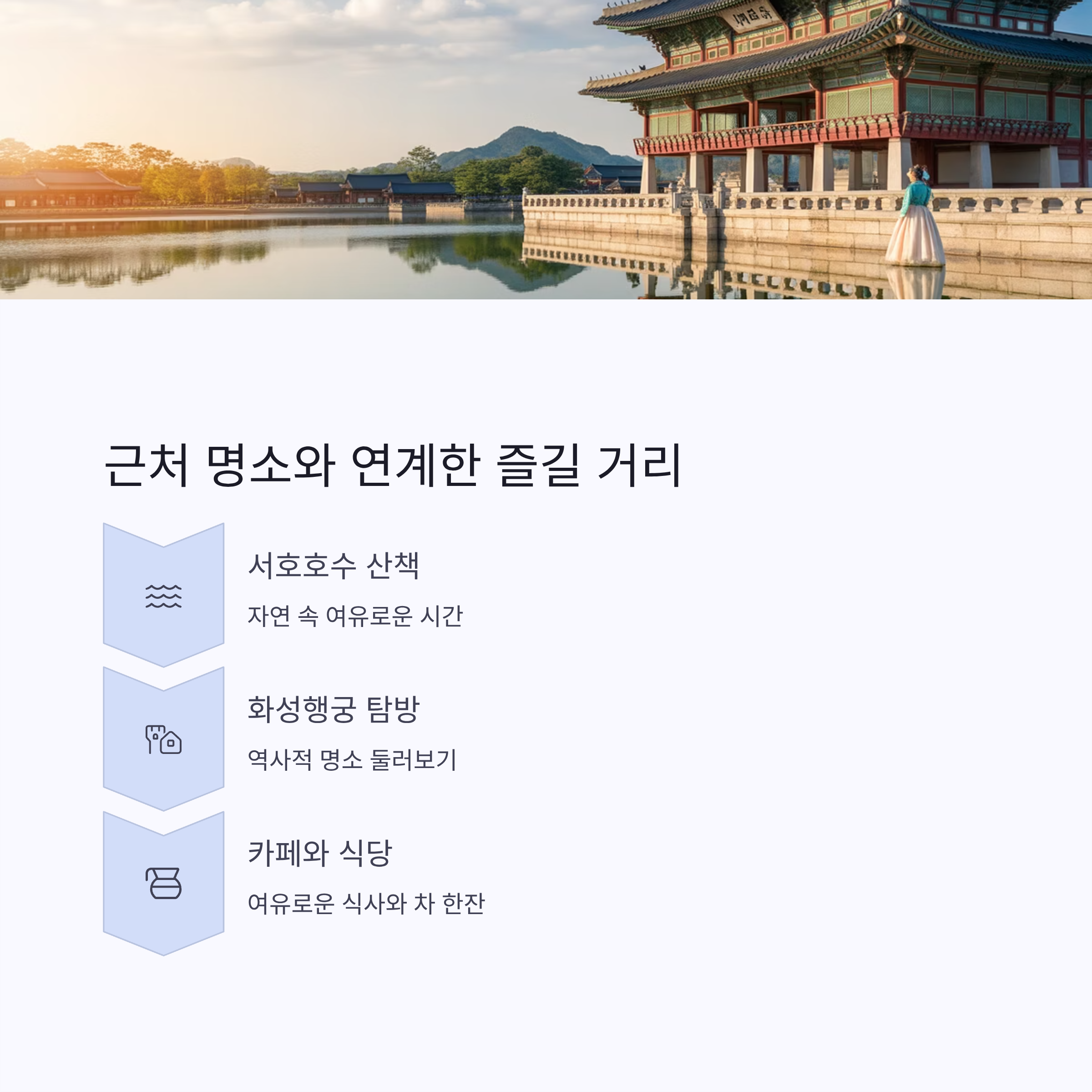 서호호수 주변에는 화성행궁, 수원화성 등 역사적 명소가 가까워 함께 둘러보기 좋아요. 호수를 먼저 산책한 뒤 수원의 문화재 탐방을 이어가면 하루 일정이 알차게 채워지죠. 또한 주변에 작은 카페와 식당들이 있어 산책 후 여유로운 식사나 차 한잔을 즐길 수 있는 것도 매력 포인트예요.