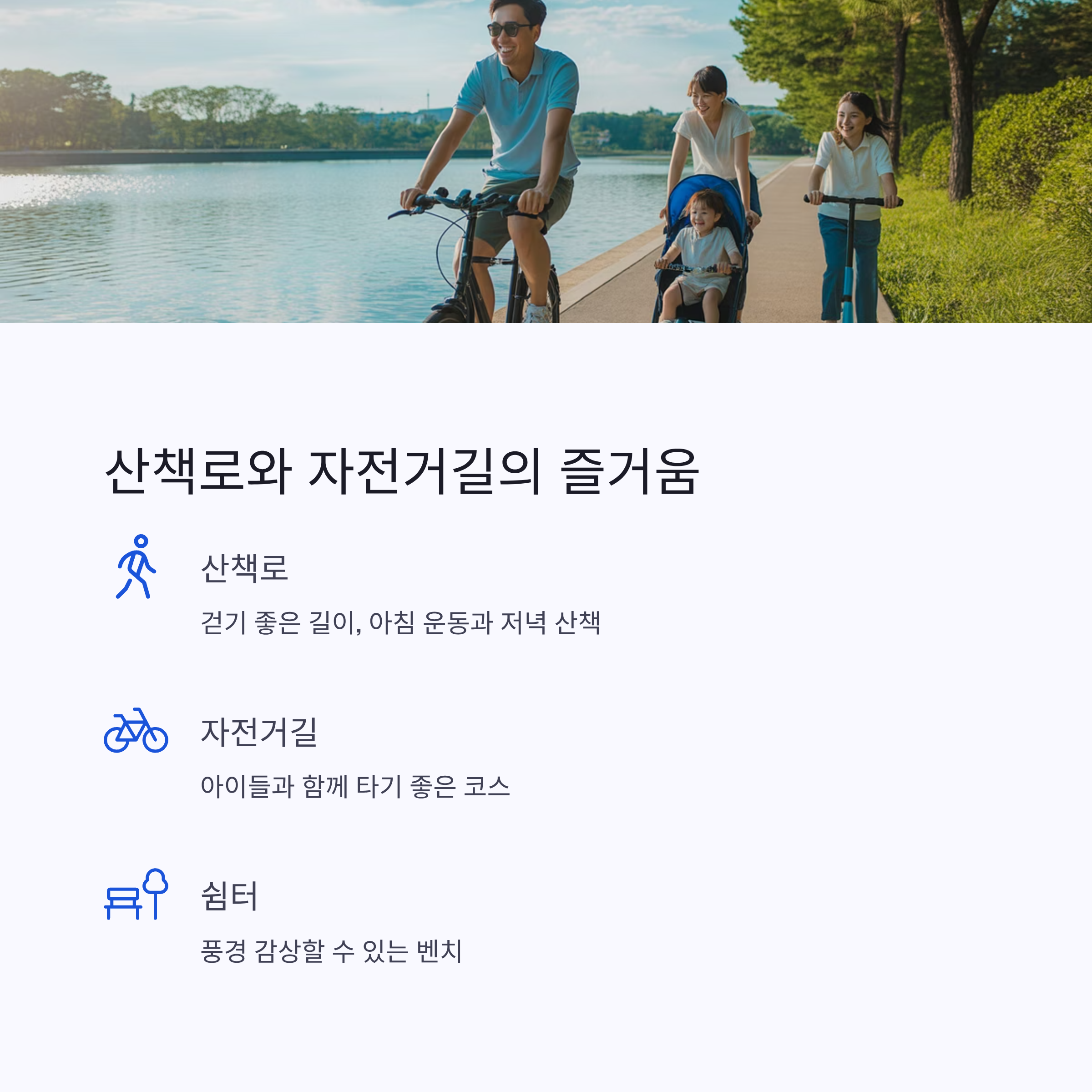 호수를 따라 조성된 산책로는 걷기 좋은 길이에요. 아침 운동을 하러 나온 시민들도 많고, 저녁에는 석양을 바라보며 산책하는 사람들로 붐비죠. 자전거길도 함께 마련돼 있어 아이들과 함께 타기에도 좋아요. 길을 따라 걷다 보면 작은 쉼터도 있어 잠시 앉아 풍경을 감상하기에도 그만이랍니다.