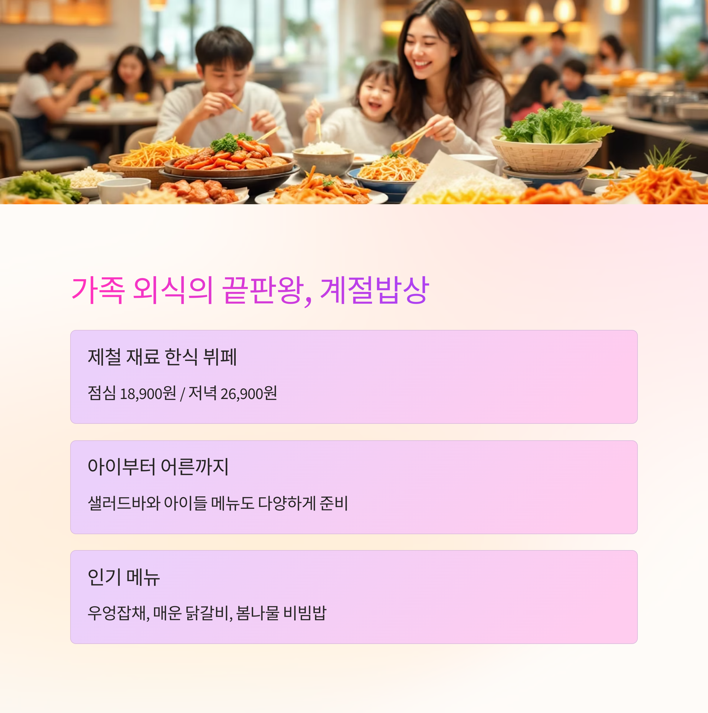 "아이부터 어른까지 모두 만족하는 뷔페형 한식 레스토랑입니다."