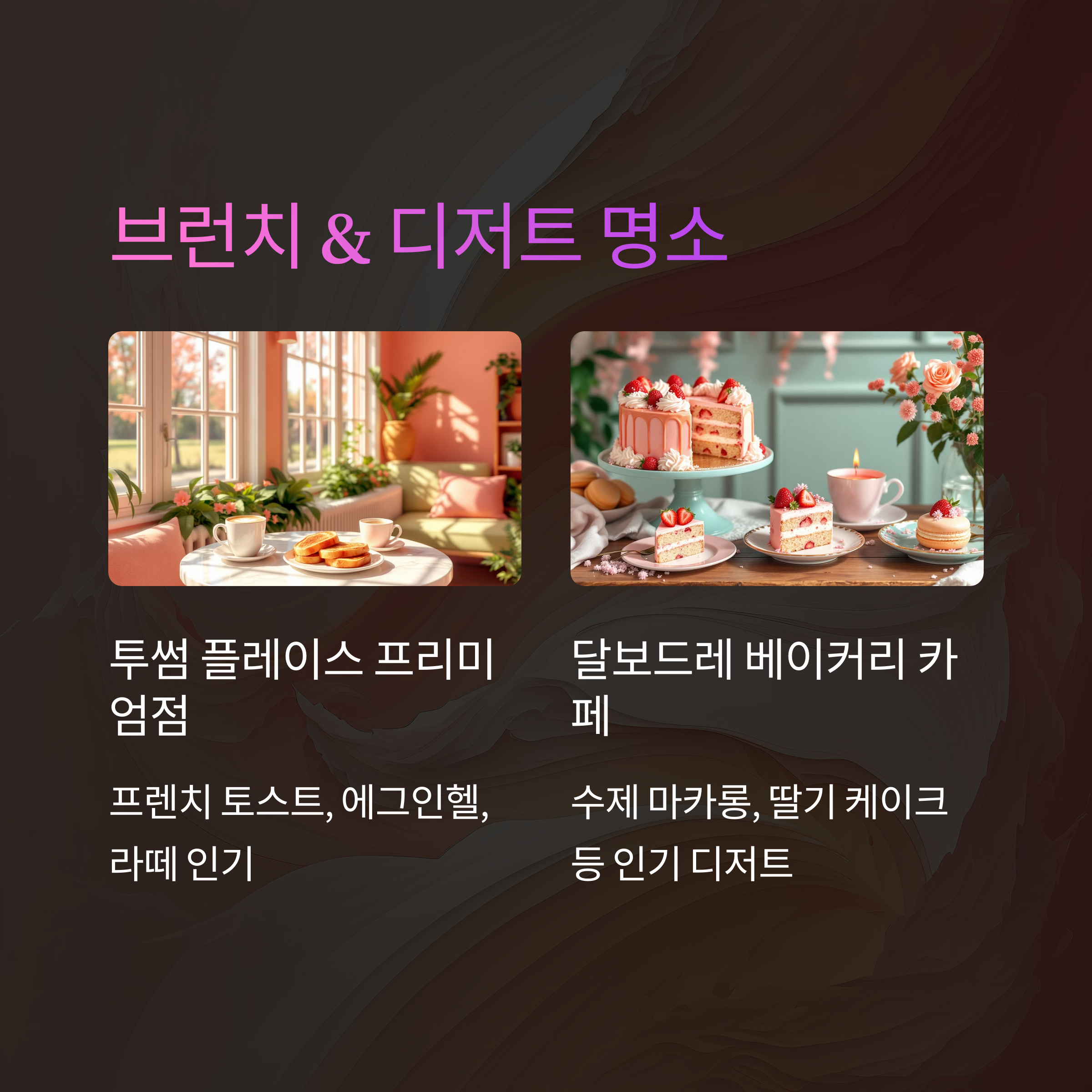 - 수제 마카롱, 밀푀유, 딸기 케이크 등이 특히 인기